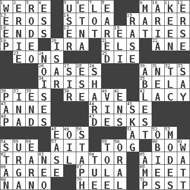 ACROSS 1. We are 5. Ubangi River tributary 9. Create 13. Greek god of love 14. Portico 15. More valued for its uncommonness 16. Conclusions 17. Pleas 19. Sliced dessert 20. Retirement account (abbr.) 21. Raised railways 22. A saturated hydrocarbon 23. Immeasurably long periods of time 25. Expire 26. Fertile tracts in a desert 30. Pismires 34. From or relating to Ireland 35. Actor Lugosi 36. Sliced desserts 39. Break or tear apart 42. Made of lace 43. Singer Murray 44. Wash lightly 46. Groovy apts. 47. Writing tables 48. Greek goddess of the dawn 51. Smallest unit of an element 54. Take to court 57. Small island 58. Coat; cloak 60. Ribbon knot 62. Interpreter 65. Opera by Verdi 66. Match 67. Monetary unit of Botswana 68. Confront 69. Billionth: prefix 70. The bottom of a shoe or boot 71. Inconspicuous attention getter DOWN 1. Shed a tear 2. Bert's buddy 3. Cowboy competition 4. Double-curved letter 5. One who uses or employs something 6. Inactive volcano in Sicily 7. Car dealer's back yard 8. Having ears or earlike features 9. Floor protector 10. Roberta Peters solo 11. Peachy ____! 12. Celtic language 15. To erase 18. Biblical high priest 20. Austrian river, tributary to the Danube 24. Annoying sounds 27. Title for a knight 28. Compass dir. 29. Broken piece 30. Most capable 31. Teachers' org. 32. Affectionate concern, for short 33. Declare 36. Infant food 37. _ tizzy (2 wds.) 38. Conclusion 40. Compete 41. Followers of ems 45. Heroin 48. Comfort 49. Lubricate 50. Staphylococcus 52. Off-Broadway awards 53. Methods 54. Comedian Laurel of Laurel & Hardy 55. Capital and largest city of Mongolia 56. Merit 58. Lacquered or enameled metalware 59. Taken by mouth 61. Electrical Unit 63. Modern: prefix 64. Third day of the wk. 65. Electrical Unit