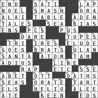 ACROSS 1. Conclude 4. Suttee (variant) 8. Infant locale 11. Christmas carol 13. Box-office sellout 15. Mouth or opening 16. Mountain range southwest of Kyrgyzstan 17. Eating place 18. An important port of Yemen 19. Lies 21. Ocean 22. Prejudice 23. Followers of ems 24. Personal Computers (abbr.) 27. Purulenc 29. Have the gumption 30. Drinks excessively 34. Three (prefix) 36. Angers 39. Evade 40. Leaves 41. Naughty children 43. ____ Bator 44. Before Barbara or Clara 46. Smallest unit of an element 47. Scottish cap 48. Goodbye (Sp.) 49. Actor's bit 51. Strike 53. And so on (abbr.) 54. Compass dir. 57. Collude with 60. Baseball player Mel 63. Expletives 65. Oceans 66. Speak pompously 69. Small pie 70. Raised railways 71. Sun: prefix 72. Toward shelter 73. Had dinner 74. Peachy ____! 75. Begley and Asner DOWN 1. Maternal 2. Pitcher Ryan 3. Allots cards 4. Fast jet (abbr.) 5. Nanny (var.) 6. Bar bills 7. Capri or Wright 8. Farming town in central California 9. Type of rug 10. Zero-star reviews 12. Falsehood 14. Pile 18. Utter; complete 20. Health resort 25. Baby bed with high sides 26. Spanish missionary in California 28. Shoshoni 29. What propaganda does 31. Monetary unit of Botswana 32. Dutch treat 33. Elected rep. 34. Frog relative 35. Painter Guido (1575-1642) 37. Consume 38. Took without asking 40. Girls' org. (abbr.) 42. Stricken, poetically 45. White ___ sheet 50. Non-commissioned officer (abbr.) 52. "Silly old bear" 54. Having lost freshness 55. Tear up 56. _____ Park, CO 57. Toward the sea 58. Waist strap 59. Relaxation 61. Long journey 62. Story 64. _ moment's notice (2 wds.) 67. Neckwear 68. A really long time