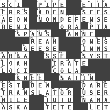 ACROSS 1. _-fi 4. Corncob 8. Singer James 12. Blunders 14. An important port of Yemen 15. Perceives with the eye 16. A really long time 17. Unrelated to defense, as in spending 20. Painter Guido (1575-1642) 21. Mouth or opening 22. Parent Teacher Assoc. 23. Connects, as a bridge 27. Singer Murray 29. 480, 500 or 516 sheets of paper 31. Singles 34. Honkers 35. Restaurants 36. Swedish rock group 39. Compass dir. 41. System (abbr.) 42. Rich soil 43. Feeling or showing extreme anger 46. Event scenes 47. Root beer relative 48. Leg joint 51. Smooth fabric 54. Eastern Standard Time (abbr.) 56. Morning condensation 58. Have the gumption 61. Interpreter 66. One who makes use of a thing 67. The longest river in the world 68. Ballerina skirt 69. Grandmother 70. "____ silly question..." 71. Wig 72. Allow DOWN 1. Dry up 2. Algonquian 3. Removes the wrinkles 4. Baking dish 5. Wedding promise 6. Writing instrument 7. Inside; within (prefix) 8. Compass dir. 9. 3-inch nail 10. Trial 11. Toward the sea 13. Clip 18. Period 19. Air blower 24. "We ___ not amused" (Victoria) 25. Born 26. Backtalk 28. Annoying sound 30. Mesonic 32. Followers of ems 33. Fast jet (abbr.) 34. Street urchin 36. 100% 37. Oct. 31 cry 38. Sass 40. Greek god of love 44. According to 45. Make lace 49. Begley and Asner 50. Snakelike fish 52. Goddess of spring and wife of Bragi 53. Rhinal 54. Inactive volcano in Sicily 55. Indian titles of respect 57. Electrical Unit 59. French philosopher Descartes 60. Part of Q.E.F. 62. Teachers' org. 63. Third day of the wk. 64. Baseball player Mel 65. Regret