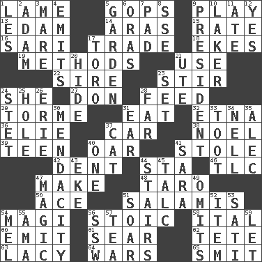ACROSS 1. Unable to walk 5. Republicans 9. Frolic 13. Dutch treat 14. Caspian sea tributary 15. Pace 16. Indian skirt 17. Swap 18. Supplements with great effort 19. Modes 21. Purpose 22. Beget 23. Move through with a circular motion 24. A female animal or person 27. Spanish title 28. Nourish 29. Singer Mel 31. Consume 32. Inactive volcano in Sicily 36. Writer Wiesel 37. Automobile 38. Christmas carol 39. Adolescent 40. Rowing implement 41. Fur scarf 42. Scratch 44. R.R. building 46. Affectionate concern, for short 47. Create 48. Pacific island yam 50. Adept person 51. Deli grouping 54. Wise men 56. Unemotional 58. Slanted text style (abbr.) 60. Give off 61. Shrivel 62. False hair 63. Made of lace 64. Armed conflicts 65. Stricken, poetically DOWN 1. French article 2. First of billions? 3. Female horse 4. Sends forth 5. Place where plants grow 6. Mouths or openings 7. Groovy apt. 8. Compass dir. 9. Elected leader of a country 10. Member of a famous L.A. basketball team 11. Had dinner 12. It is so 17. "Corrida" creature 20. Flintstone garb 21. Shoshoni 23. Arrange properly for use 24. Proofreading order 25. Opening into or through something 26. 4th largest of the Great Lakes 28. At a great distance 30. Ananias' fault 31. Hearing organ 33. A blast of a horn 34. 1994 drama film starring Jodie Foster 35. Actor Baldwin 37. Feline 40. Single 41. "Two Mules for Sister ____" 43. Supplement with great effort 44. Flight of steps 45. Baby powder 47. Mysterious quality of enchantment 49. Leaves out 51. Fly high 52. A distinct part 53. Suttee (variant) 54. Cartoonist voice _ Blanc 55. Housemaid (var.) 56. Compass dir. 57. Afternoon social gathering 59. Allow