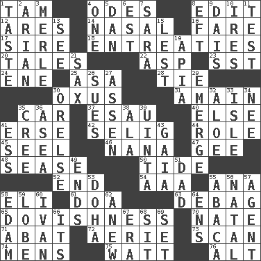 ACROSS 1. Scottish cap 4. Lyric poems 8. Prepare for publication 12. Ancient Greek god of war 14. Relating to the nose 16. Conductor's collection 17. Title for a man of rank and authority 18. Pleas 20. Falsehoods 22. Cleo's killer 23. Fast jet (abbr.) 24. Compass dir. 25. White ___ sheet 28. Make a knot 30. The longest river in Central Asia 31. With great haste 35. Auto 37. He sold his birthright 40. Otherwise 41. Celtic language 42. Major League Baseball Commissioner Bud 44. Hero or heavy, e.g. 45. Sew up the eyelids of hawks and falcons 46. Grandmother 47. Unit of force equal to gravity 48. Gospel singer Marvin 50. Event that recurs at intervals 52. Conclusion 54. Auto club (abbr.) 55. Santa ___, CA 58. Biblical high priest 61. ___ good deed 63. Debunk (Brit. slang) 65. Innocence, gentleness, or tenderness 70. Nathan's nickname 71. Blind as ____ 72. Nest on high 73. Examine minutely or intensely 74. Not women's 75. Electrical Unit 76. Keyboard modifier key DOWN 1. Clothes sense 2. Believer in; advocate of (suffix) 3. Haggard of country music 4. Single 5. One of the 12 tribes of Israel 6. Eastern Standard Time (abbr.) 7. "Two Mules for Sister ____" 8. Lizard (obsolete) 9. Raised platform 10. Angers 11. Trial 13. Observe 15. For fear that 19. Capital of Western Samoa 21. Saxophone 26. Takes to court 27. NE Netherlands city 29. Develop 30. Threatening words 32. _ vera 33. Capri or Wright 34. Born 35. Algonquian 36. Toward the sea 38. In the manner of 39. National forest in Provo, Utah 41. Double-curved letter 43. Greek goddess of the earth (variant) 49. Extremities 51. Male parent 53. Capital of the state of Qatar 55. Phillipine bananalike plant 56. Brizilian seaport 57. Rep 58. Dutch treat 59. Ear part 60. "Terrible" tsar 62. Afresh 64. Followers of ems 66. ___ a Wonderful Life 67. Period 68. Be seated 69. Put into a specified state