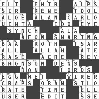 ACROSS 1. Connecticut Ivy Leaguer 4. Arab leader 8. High mountains 12. Title for a knight 13. French philosopher Descartes 14. Utensil 15. _ vera 17. ____ Jay Lerner 18. Monte _, Las Vegas Hotel/Casino 19. National forest in Provo, Utah 21. Wedding promise 23. Sight organ 24. Synchronize (abbr.) 26. Chicken ___ king 28. A really long time 30. Catching in a trap 34. Sound made by sheep 37. Writer of Portnoy's Complaint (1969) 39. Russian ruler of old 40. 100% 41. Assad's deity 43. Had dinner 44. To erase 46. 1/640 square mile 47. Marina Del _, California 48. "Death Wish" actor 51. Hiding places for outlaws 54. Spanish title 55. Domineers 58. Oval reproductive body of a fowl 61. Soggy 63. One who wires 65. Dice game 67. NW Algerian seaport 71. Grain storage tower 72. Pace 73. Prong on a fork 74. Pipe bend 75. One who uses or employs something 76. Prepare for publication 77. Compass dir. DOWN 1. Son of Isaac 2. Ms. Damita and namesakes 3. Literary sarcasm 4. Epoch 5. Cartoonist voice _ Blanc 6. _ tizzy (2 wds.) 7. Painter Guido (1575-1642) 8. _ moment's notice (2 wds.) 9. Old wives' tales, e.g. 10. Much (prefix) 11. A type of plum 16. Inactive volcano in Sicily 18. Root beer relative 20. Adept person 22. One of the 12 tribes of Israel 25. Israeli folk dance 27. Tate display 29. Pitcher Ryan 30. Broken piece 31. Austrian river, tributary to the Danube 32. Nathan's nickname 33. Jennifer or Joel 34. Sharp remark 35. Having or resembling wings 36. In addition 38. Affectionate concern, for short 42. Person who is morally reprehensible 45. Conclude 49. Sty mamas 50. Single 52. At this time 53. Indian titles of respect 56. Frees from moisture 57. Exchanges for money 58. Shade of tan 59. Pate de foie ____ 60. Yard entry 62. Lug 64. Hero or heavy, e.g. 66. For each 68. To free from 69. Cuckoo 70. Fish or hair follower