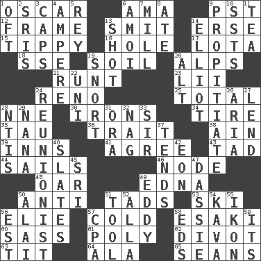 ACROSS 1. Motion picture award 6. Nanny (var.) 9. Pacific Standard Time (abbr.) 12. Movie unit 13. Stricken, poetically 14. Celtic language 15. Likely to tip or tilt 16. Hollow 17. Globular water bottle used in Asia 18. Compass dir. 19. The visible part of the earth's surface 20. High mountains 21. Undersized animal 23. Cards in a Roman deck? 24. Western Nevada city 25. Add up to 28. Compass dir. 30. Removes the wrinkles 34. Become fatigued 35. The 19th letter of the Greek alphabet 36. Distinguishing feature 38. The 18th letter of the Arabic alphabet 39. Lodging establishments 41. Match 43. Small amount or degree 44. Moves on water 46. Connecting point 48. Rowing implement 49. Pulitzer Prize-winning author Ferber 50. Opposed to 51. Small amounts or degrees 53. What Jean-Claude Killy likes to do 56. Writer Wiesel 57. Having a low temperature 58. 1973 Nobel Price Winner (Physics) Leo 60. Backtalk 61. Many (prefix) 62. A piece of turf (Scot.) 63. Teat (slang) 64. In the manner of 65. Seines DOWN 1. Often (poetically) 2. Indian titles of respect 3. Smile enhancers 4. Electrical Unit 5. Marina Del _, California 6. Mine, in Marseilles 7. Place where flour is made 8. Had dinner 9. Conciliate 10. Fast planes 11. Afternoon social gathering 13. Guess 14. American author Paul (1891-1958) 19. Derisive sound 20. The first octave above the treble staff 22. University (slang) 24. One who advocates reunion 26. Roberta Peters solo 27. Grant temporary use of 28. Nuclear Threat Initiatives 29. Grandmother 31. Mouth or opening 32. Tired old horse 33. Title for a knight 37. Is inclined (to) 40. Chalkboards 42. Age 45. _ Lanka 47. Small ungulate mammals of Africa 49. Whirlpool 50. Jai ____ 51. Utensil 52. Silent film actress Nazimova 54. Polynesian shrub of the pepper family 55. Visual representation of an object 56. Eastern Standard Time (abbr.) 57. Accounting whiz (abbr.) 58. Begley and Asner 59. It is