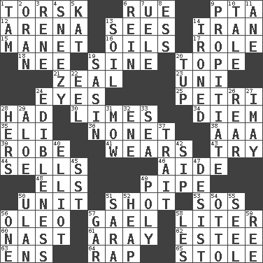 ACROSS 1. Cod relative 6. Regret 9. Parent Teacher Association (abbr.) 12. Sports stadium 13. Observes 14. SW Asia republic 15. French painter Edouard 16. Petroleums 17. Hero or heavy, e.g. 18. Born 19. Trig term 20. Drink excessively 21. Ardor 23. University (slang) 24. Sight organs 25. _ dish (used to culture cells) 28. Possessed 30. Citrus fruits 34. South Vietnam president (1954) 35. Connecticut Ivy Leaguer 36. Music written for nine 38. American Automobile Association (abbr.) 39. Loose flowing garment 41. Erodes 43. Attempt 44. Makes a sale 46. Assistant 48. Raised railways 49. Corncob 50. A single undivided whole 51. Went for two points 53. Mayday 56. Margarine 57. Highlander 58. 61 cubic inches 60. Political cartoonist Thomas 61. Like ___ of sunshine 62. First name in cosmetics 63. Followers of ems 64. Reproach for some lapse or misdeed 65. Took without asking DOWN 1. Scottish cap 2. Northwest Algerian city 3. French philosopher Descartes 4. Dwarf with a sinus problem 5. Krazy ___ of comics 6. It's straight from the horse's mouth 7. Ubangi River tributary 8. Double-curved letter 9. Appease 10. Lie 11. A saturated hydrocarbon 13. Land 14. Pressed 19. Indian antelope 20. Uncastrated adult male sheep 22. Snakelike fish 24. The property of being fit to eat 26. Posterior 27. "If ____ say so..." 28. Possessive pronoun 29. _ vera 31. Cut the grass 32. Compass dir. 33. Ocean 37. Distinguishing feature 40. American author Paul (1891-1958) 42. Small drink 45. Fast jet (abbr.) 47. Cease 49. Much (prefix) 50. Uhlan (variant) 51. "Two Mules for Sister ____" 52. Pile 54. "Beetle Bailey" pooch 55. Sew up the eyelids of hawks and falcons 56. Single 57. Slender fish 58. French article 59. To sift