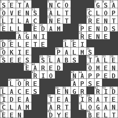ACROSS 1. Stalk of a moss capsule 5. Non-commissioned officer (abbr.) 8. Girls' org. (abbr.) 11. Baking chambers 13. Keyboard modifier key 14. Hoof sound 15. Pale purple color 16. Fish or hair follower 17. Monthly bill 18. Pipe bend 19. Dutch treat 21. Depends 22. Hindu god of fire 24. French philosopher Descartes 25. Erase 27. Flowery wreath 29. Migrant worker of the '30s 30. Insides of hands 32. Perceives with the eye 33. Broad, flat, thick pieces 35. Lie 39. Having ears or earlike features 41. Sign of something about to happen 42. River (Sp.) 43. Slept 45. Old wives' tales, e.g. 48. Domed church section 49. Shoestrings 50. Engineer (abbr.) 52. To free from 55. The main thing one is thinking about 56. Afternoon social gathering 57. Feeling or showing extreme anger 59. Burrowing marine mollusk 60. Nonscientific branch of learning 61. Utah city north of Ogden 62. Car or cant ending 63. Color 64. Waist strap DOWN 1. Not divided or shared with others 2. Morally bad or wrong 3. Copy Pinocchio 4. Santa ___, CA 5. Nanny 6. To starve (Brit.) 7. Baseball player Mel 8. American astronaut and politician John 9. Something which is sent 10. Flats, for short 12. Odor 14. Algonquian 20. Expire 21. Demure 23. Honkers 25. Two (Sp.) 26. Make supply last 27. Experiment locale 28. Raised railways 30. Writing tablet 31. Discontinues 33. _ Lanka 34. Lion 36. Electrical Measurement 37. Area sheltered from the wind 38. Conclusion 40. Ancient Greek god of war 43. Tired old horse 44. Showery time 45. Dipping utensil 46. Sea 47. 480, 500 or 516 sheets of paper 49. Louse (plural) 50. Suggestive of the supernatural 51. Nathan's nickname 53. Slanted text style (abbr.) 54. Scratch 56. Small boy 58. Director Reiner