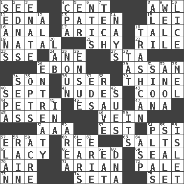ACROSS 1. Perceive with the eye 4. Penny 8. Leather borer 11. Pulitzer Prize-winning author Ferber 13. Eucharist need 15. Luau accessory 16. Of or related to the anus 17. N. Chile seaport 18. Baby powder 19. Brizilian seaport 21. Like a shrinking violet 22. Cause heat under the collar 23. Compass dir. 24. A saturated hydrocarbon 27. R.R. building 29. Inky black, to poets 30. Indian state 34. Male child 36. One who makes use of a thing 39. One or ones belonging to thee 40. Back-to-school mo. 41. Unclothed pictures 43. Calm and collected 44. _ dish (used to culture cells) 46. He sold his birthright 47. Santa ___, CA 48. NE Netherlands city 49. Distinctive style or manner 51. American Automobile Association (abbr.) 53. Eastern Standard Time (abbr.) 54. Air pressure measure (abbr.) 57. Part of Q.E.F. 60. To sift 63. Table seasonings 65. Made of lace 66. Having ears or earlike features 69. Lick closed 70. Wind 71. Believer in; advocate of (suffix) 72. Diluted with white 73. Compass dir. 74. Bristle 75. Put into a specified state DOWN 1. Actors Connery and Penn 2. Ferber et al. 3. Maternal 4. Tax preparer (abbr.) 5. Ewer handle 6. Nuclear Threat Initiatives 7. Georgia ____ (Atlanta school) 8. Jai _ 9. Water source 10. Louse (plural) 12. Wing 14. Negative votes 18. File 13 20. Experiment locale 25. Part of speech 26. Follow as a consequence or result 28. Make lace 29. Plea 31. The Jewish people; Israel 32. Small Philippine buffalo 33. Cartoonist voice _ Blanc 34. Observes 35. Chooses 37. Begley and Asner 38. Break or tear apart 40. Health resort 42. Institutes legal proceedings 45. _ tizzy (2 wds.) 50. ___ a Wonderful Life 52. Length times width 54. Entreaties 55. Having lost freshness 56. Small island 57. Style 58. Precipitation 59. 43,560 square feet 61. Hearing organs 62. One of the Great Lakes 64. Cleo's killer 67. Erode 68. Heredity factor (abbr.)
