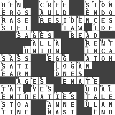 ACROSS 1. Layer 4. Algonquian 8. The Jewish people; Israel 12. Greek god of love 14. Old (Scot.) 15. Inside; within (prefix) 16. To erase 17. Homes 20. Proofreading order 21. The 23rd letter of the Hebrew alphabet 22. Binary compound 23. Gurus 27. Necklace unit 29. Silent film actress Nazimova 31. Monthly bill 34. The state of being joined or united 35. South American Indian 36. Backtalk 39. Oval reproductive body of a fowl 41. Tiny particle 42. Suttee (variant) 43. Utah city north of Ogden 46. Merit 47. Singles 48. Ripens 51. Maternal 54. Make lace 56. It is so 58. Freehold land 61. Pleas 66. Story 67. Portico 68. Queen of England 1702-14 69. Uhlan (variant) 70. Prong on a fork 71. Political cartoonist Thomas 72. Conclusion DOWN 1. Possessive pronoun 2. Part of Q.E.F. 3. Olfactory organs 4. Automobile 5. Regret 6. Raised railways 7. Prepare for publication 8. Elected rep. 9. Happening 10. Wrote a lyric poem 11. Characteristic smell of wine 13. Bristle 18. Small moist lump or mass 19. She-sheep 24. Separate the seeds from cotton 25. Connecticut Ivy Leaguer 26. _ gin 28. Believer in; advocate of (suffix) 30. White American of non-Hispanic descent 32. Non-commissioned officer (abbr.) 33. Scottish cap 34. Putting into practice 36. Compass dir. 37. American Automobile Association (abbr.) 38. Ski resort town in Vermont 40. Went 44. Commissioned military rank (abbr.) 45. White ___ sheet 49. Sight organ 50. Ocean 52. Ballerina skirt 53. Peak District village in England 54. Trial 55. Against 57. Comedian Laurel of Laurel & Hardy 59. ____ Jay Lerner 60. Grant temporary use of 62. Actress Charlotte 63. _ tizzy (2 wds.) 64. Followers of ems 65. Arrange properly for use
