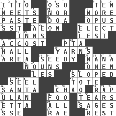 ACROSS 1. "Tell ____ the Marines!" 5. Bear (Spanish) 8. Nine, plus one 11. Confronts 13. And not 14. Greater amount 15. Thick mixture 16. ___ good deed 17. Musical composition 18. Fast jet (abbr.) 19. Period of immesurable duration 21. Voters do this 22. Taverns 24. For fear that 25. Buttonhole 27. Parent Teacher Assoc. 29. Promenade 30. Entertaining tales 32. Type of rug 33. Morally degraded 35. Nanny 39. Parts of speech 41. Presage 42. French article 43. Had an oblique or slanted direction 45. Stitch closed the eyes of (a falcon) 48. Carryall 49. Before Barbara or Clara 50. US Secretary of Labor Elaine L. _ 52. Reproach for some lapse or misdeed 55. ____ Bator 56. Egg _ yung 57. Pulls apart 59. Singer James 60. 100% 61. Gurus 62. Compass dir. 63. Actress Charlotte 64. Repose DOWN 1. Naughty children 2. Beverages made from leaves 3. A testis 4. Baseball player Mel 5. Southwest Nigerian state 6. Within a short period 7. Mouth or opening 8. Drinks excessively 9. Spew [out] 10. A home for chicks 12. Actors Connery and Penn 14. Undercover agent 20. Eastern Standard Time (abbr.) 21. Liveliness 23. Pitcher Ryan 25. Nursemaid (var.) 26. 4-wheeled motor vehicle 27. Writing tablet 28. Attempt to accomplish something 30. Affirmative reply 31. Snout, nose 33. Take to court 34. Followers of ems 36. Electrical Measurement 37. Born 38. Plus 40. Rounded earthenware pot or jar 43. R.R. building 44. Plunders 45. Table seasonings 46. Maternal 47. Inactive volcano in Sicily 49. Takes to court 50. Root beer relative 51. Hollow 53. Ancient Greek god of war 54. Inconspicuous attention getter 56. At a great distance 58. Hearing organ