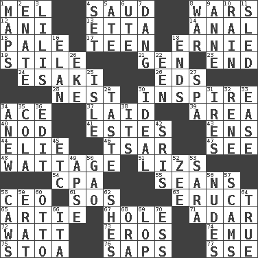 ACROSS 1. Cartoonist voice _ Blanc 4. Saudi Arabian king (1953-1964) 8. Armed conflicts 12. Black tropical American cuckoo 13. Singer James 14. Of or related to the anus 15. Diluted with white 17. Adolescent 18. Bert's buddy 19. Vertical member of a panel or frame 21. Commissioned military rank (abbr.) 23. Conclusion 24. 1973 Nobel Price Winner (Physics) Leo 26. Begley and Asner 28. Egg locale 30. Stimulate to action 34. Adept person 37. Put down 39. Length times width 40. Allow head to fall sleepily 41. _____ Park, CO 43. Followers of ems 44. Writer Wiesel 46. Russian ruler of old 47. Perceive with the eye 48. Electrical Measurement 51. Belonging to Elizabeth 54. Numbers guy (abbr.) 55. Actors Connery and Penn 58. Corporate head (abbr.) 61. Mayday 63. Spew [out] 65. Nick name for Arthur 67. Opening into or through something 71. The sixth month of the Jewish calendar 72. Electrical Unit 73. Greek god of love 74. Australian flightless bird 75. Portico 76. Plant excrements 77. Compass dir. DOWN 1. Atlas contents 2. Maternal 3. Ms. Damita and namesakes 4. Put into a specified state 5. Had dinner 6. Shoshoni 7. Mild oath, euphamism for damn 8. Armed conflict 9. Singer Murray 10. Water falling in drops from the sky 11. Downhill vehicle 16. Style 18. Conclusions 20. Supplement with great effort 22. Car or cant ending 25. Capri or Wright 27. Health resort 29. Clothes sense 30. Perfect 31. Angers 32. French philosopher Descartes 33. Relaxation 34. Afresh 35. Root beer relative 36. Prepare for publication 38. It is 42. Indian titles of respect 45. And so on (abbr.) 49. Domed church section 50. E Mali city 52. Last letter of the English alphabet 53. "Two Mules for Sister ____" 56. Unclothed pictures 57. Fraudulent business schemes 58. Crow sounds 59. Part of Q.E.F. 60. Von Bismarck 62. "______ My Girl" (Turtles hit) 64. Loyal 66. Call ___ day 68. Mouth or opening 69. Chop off 70. Curvy letter