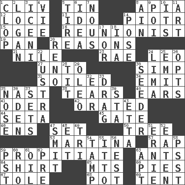 ACROSS 1. 154 in Roman numerals 5. Shallow baking pan 8. Capital of Western Samoa 12. Event scenes 13. Wedding promise 14. Peter (Polish) 15. Double curve, resembling the letter S 16. One who advocates reunion 19. Baking dish 20. Thinks logically 21. Mediterranean tributary 23. Actress Charlotte 24. Lion 27. To (old English) 30. Simple or foolish person 31. Dirtied 34. Give off 35. Political cartoonist Thomas 38. Pulls apart 40. Hearing organs 41. River in Europe 42. Declaimed 44. Stalk of a moss capsule 45. Yard entry 46. Followers of ems 47. Arrange properly for use 50. Relationship diagram 53. Chrissie's court nemesis 57. Reproach for some lapse or misdeed 59. Conciliate 63. Pismires 64. Upper-body garment 65. Mountains (abbr.) 66. Sliced desserts 67. Lacquered or enameled metalware 68. Plant holder 69. Portable shelter DOWN 1. Hoof sound 2. Utah city north of Ogden 3. Ancient Celtic tribe of eastern Britain 4. Compete 5. Hoop that covers a wheel 6. It may be bright or harebrained 7. Common sense 8. The 18th letter of the Arabic alphabet 9. Luau course 10. ___ a Wonderful Life 11. Tate display 14. Airs 17. Or not 18. _ tizzy (2 wds.) 20. Western Nevada city 22. A period of five years 24. Pale green bean 25. Arab leader 26. Elects 28. Teat (slang) 29. Butter sub 30. Sowing specialist 32. Ewer handle 33. To be drawn or hauled along 35. Characteristic smell of wine 36. Arabian gulf 37. Arranges properly for use 39. R.R. building 43. Singer James 47. Stricken, poetically 48. Erode 49. Three (prefix) 51. Bert's buddy 52. Ingested 54. Pack (down) 55. "Tell ____ the Marines!" 56. A home for chicks 58. Inconspicuous attention getter 59. Pacific Standard Time (abbr.) 60. 17th letter of the Greek alphabet 61. Petroleum 62. Before (prefix) 63. Fitting