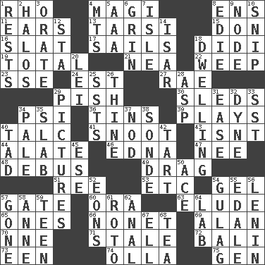 ACROSS 1. 17th letter of the Greek alphabet 4. Wise men 8. Followers of ems 11. Hearing organs 13. Tarsus (plural) 15. Spanish title 16. Narrow board 17. Moves on water 18. "You Light Up My Life" star Conn 19. Add up to 21. Teachers' org. 22. Shed a tear 23. Compass dir. 24. Eastern Standard Time (abbr.) 27. Actress Charlotte 29. Expression of disdain 30. Bobsleighs 34. 23rd letter of the Greek alphabet 36. Airtight sealed metal containers 39. Frolics 40. Baby powder 41. Snout, nose 43. Is not 44. Having winglike extensions 46. Pulitzer Prize-winning author Ferber 47. Born 48. To get out of a bus 49. To draw with force 51. To riddle 53. And so on (abbr.) 54. Set 57. Yard entry 60. Mouth or opening 63. Dodge 65. Singles 66. Music written for nine 69. ____ Jay Lerner 70. Compass dir. 71. Showing deterioration from age 72. Indonesian resort city 73. Car or cant ending 74. Water jar 75. Commissioned mil. rank DOWN 1. Musical pauses 2. Rings 3. Speak pompously 4. Mountains (abbr.) 5. American Automobile Association (abbr.) 6. Amused look 7. Capri or Wright 8. Singer Brickell 9. Connecting point 10. Clip 12. R.R. building 14. Austrian river, tributary to the Danube 18. Home 20. Luau accessory 25. Fast planes 26. One or ones belonging to thee 28. Cleo's killer 29. Photos 31. Comfort 32. Centimeter-gram-second unit of force 33. Fast jet (abbr.) 34. Diluted with white 35. Thick slice 37. Lower and raise head in agreement 38. Something which is sent 40. Bit 42. Small pie 45. Compass dir. 50. Adept person 52. Immeasurably long periods of time 54. POW camp 55. Peak District village in England 56. Soviet premier 1918-24 57. Went 58. Queen of England 1702-14 59. Adolescent 61. Printing process, for short 62. Of or related to the anus 64. Experiment locale 67. Pipe bend 68. Afternoon social gathering