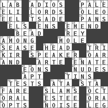 ACROSS 1. Experiment locale 4. Goodbye (Sp.) 9. Light colored 13. Connecticut Ivy Leaguer 14. Domineers 15. Margarine 16. Snakelike fish 17. Sadhe (variant) 18. Zero-star reviews 19. Raised railways 21. Followers of ems 22. Make improvements or corrections to 24. Necklace unit 26. Marina Del _, California 27. Amid 29. Undercover agent 30. Gospel singer Marvin 31. Froth on beer 33. Three (prefix) 36. Apertif with cassis 37. Orator 40. Rowing implement 41. Also 42. Johnson of "Laugh-In" 43. Related on the mother's side 45. Immeasurably long periods of time 47. Unclothed pictures 48. Fitting 49. Metal containers 50. Trials 52. "One Day ___ Time" 54. R.R. building 56. Conductor's collection 57. Criticizes harshly 59. Sep. follower 61. Relating to the mouth 62. First name in cosmetics 63. Mouth or opening 64. Chooses 65. Annoying sound 66. Part of a journey DOWN 1. Area sheltered from the wind 2. Toward shelter 3. Big road sign 4. The first octave above the treble staff 5. Administered medicine 6. SW Asia republic 7. Likelihood 8. Compass dir. 9. Wimpy's pal 10. Actor Alda or Thicke 11. Grant temporary use of 12. Greek goddess of the dawn 20. Elected reps. 22. Eat (away) 23. Cartoonist voice _ Blanc 25. Matures 27. "____ silly question..." 28. Count _ (2 wds.) 29. Create 31. Possessive pronoun 32. Ingest 33. Inedible or poisonous agaric 34. Assign a rank or rating to 35. Angers 38. Leg coverings 39. Painter Guido (1575-1642) 44. Religious women 45. Artist's stands 46. Choose 49. Domesticates 50. Canvas cover 51. Part of Q.E.F. 52. In addition 53. Jacques of French films 55. 43,560 square feet 56. Egg _ yung 57. Elected rep. 58. Perceive with the eye 60. Label