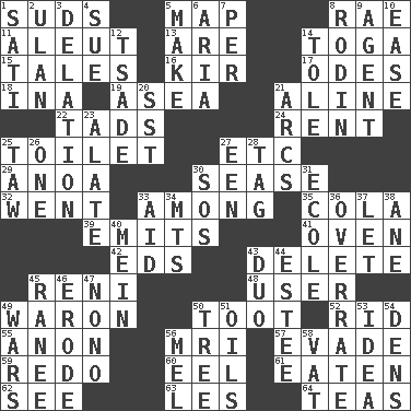 ACROSS 1. Beer foam 5. Atlas unit 8. Actress Charlotte 11. Eskimo relative 13. "We ___ not amused" (Victoria) 14. Ancient Roman robe 15. Falsehoods 16. Apertif with cassis 17. Lyric poems 18. _ tizzy (2 wds.) 19. At sea 21. Place in a line 22. Small amounts or degrees 24. Monthly bill 25. Bathroom plumbing fixture 27. And so on (abbr.) 29. Small Philippine buffalo 30. Gospel singer Marvin 32. Gone 33. Amid 35. Root beer relative 39. Sends forth 41. Baking chamber 42. Begley and Asner 43. Keyboard key 45. Painter Guido (1575-1642) 48. One who makes use of a thing 49. Make _____ (do battle with) 50. A blast of a horn 52. To free from 55. Soon (poet.) 56. Medical imaging device (abbr.) 57. Elude 59. Make new 60. Snakelike fish 61. Ingested 62. Observe 63. French article 64. Afternoon social gatherings DOWN 1. Suttee (variant) 2. Uhlan (variant) 3. Accusation by an informer 4. Take to court 5. Cause to be 6. Operatic vocal solo 7. For each 8. "The Thinker" sculptor 9. Rep 10. Relaxation 12. Sadhe (variant) 14. Lacquered or enameled metalware 20. Fast jet (abbr.) 21. Curves 23. Having winglike extensions 25. The 23rd letter of the Hebrew alphabet 26. Single 27. Car or cant ending 28. Label 30. Distress signal 31. Learning spot: Fr. 33. Help 34. Mountains (abbr.) 36. Make much ado about nothing 37. Allow 38. A saturated hydrocarbon 40. Count _ (2 wds.) 43. Superhero pair 44. First name in cosmetics 45. The wife of a rajah (variant) 46. Eat (away) 47. Words to Nanette 49. Armed conflicts 50. Family _ (genealogy) 51. Lubricates 53. It may be bright or harebrained 54. Habitations of wild animals 56. Cartoonist voice _ Blanc 58. Large container