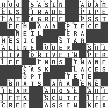 ACROSS 1. Friend of Pooh 4. Indian antelope 9. First man 13. Raised railways 14. Barter 15. Corncob 16. Consume 17. Match 18. Inconspicuous attention getter 19. Opposite of masc. 21. American Automobile Association (abbr.) 22. Part 24. Famous astronaut Armstrong 26. Epoch 27. Mesonic 29. Play the lead 30. Place in a line 31. Baltic tributary 33. _ Lanka 36. 54 in ancient Rome 37. Popular '50s hangout 40. For each 41. Area sheltered from the wind 42. Conclusions 43. Empty; void 45. Keg 47. Shoestrings 48. Choose 49. False hair 50. Naughty children 52. Santa ___, CA 54. She-sheep 56. Pull apart 57. Came up 59. Tate display 61. Allows 62. Turtle shell scale 63. Whopper 64. Algonquian 65. NE Netherlands city 66. A weed DOWN 1. To sift 2. Norwegian king 3. Clearly or manifestly demonstrative 4. R.R. building 5. Therefore, facetiously 6. "Two Mules for Sister ____" 7. The content of cognition 8. Born 9. Seem 10. Flat circle 11. Domed church section 12. Was introduced to 20. Chow _ 22. _ dish (used to culture cells) 23. Retirement account (abbr.) 25. On the rocks 27. Promenade 28. Writer Wiesel 29. Observes 31. Pig sound 32. Movie disc 33. High altitude stroll 34. French philosopher Descartes 35. Angers 38. Musical pauses 39. The longest river in the world 44. Nathan's nickname 45. Unrefined 46. Fitting 49. Clothes sense 50. Fermented drink made from hops 51. Assign a rank or rating to 52. Arches 53. Common sense 55. 4th largest of the Great Lakes 56. Affectionate concern, for short 57. White ___ sheet 58. Car or cant ending 60. John Ritter's dad
