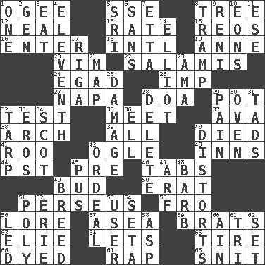 ACROSS 1. Double curve, resembling the letter S 5. Compass dir. 8. Family _ (genealogy) 12. Be tempered by heat 13. Assign a rank or rating to 15. Vintage cars 16. Keyboard key 18. International (abbr.) 19. Singer Murray 20. Zeal 22. Deli grouping 24. Mild oath 26. Mischievous child 27. California wine valley 28. ___ good deed 29. Cooking vessel 32. Trial 35. Rendezvous 37. Actress Gardner 38. Bowlike part 39. Everything 40. Passed on 41. Friend of Pooh 42. Stare 43. Lodging establishments 44. Pacific Standard Time (abbr.) 45. Before (prefix) 46. Bar bills 49. Partially opened flower 50. Part of Q.E.F. 51. Son of Zeus who helped slay Medusa 55. From 56. Old wives' tales, e.g. 57. Toward the sea 59. Naughty children 63. Writer Wiesel 64. Allows 65. Become fatigued 66. Colored 67. Hit sharply and swiftly 68. In a ____ (agitated or irritated) DOWN 1. Single 2. Commissioned mil. rank 3. Consume 4. Veterans Day date 5. _ Lanka 6. Without 7. Singer James 8. _____ steamer (cargo ship) 9. Painter Guido (1575-1642) 10. Immeasurably long periods of time 11. Compass dir. 14. American author Paul (1891-1958) 17. Port city in Latvia 21. Atlas unit 23. Wet nurse (var.) 25. Break 28. Erase 29. Ache 30. Baking chamber 31. Small amounts or degrees 32. Canvas cover 33. Greek god of love 34. Highlander 36. Pipe bend 40. What propaganda does 42. Severe or trying experience 45. Suppuration 47. Sandy's bark 48. Sharp remark 49. A special lineage 51. Much (prefix) 52. One of the Great Lakes 53. One who uses or employs something 54. Bristle 56. Directed 58. Cleo's killer 60. The 18th letter of the Arabic alphabet 61. Three (prefix) 62. Arrange properly for use