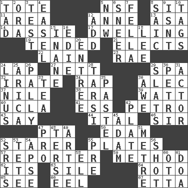 ACROSS 1. Carryall 5. Overdraft (abbr.) 8. Be seated 11. Type of rug 12. Singer Murray 13. White ___ sheet 14. Small ungulate mammals of Africa 17. Home 19. Watched over 21. Opts 22. (Had) reclined 23. Actress Charlotte 24. Infant locale 27. Remaining after all deductions 29. Health resort 32. Feeling or showing extreme anger 34. Strike 36. Actor Baldwin 37. Mediterranean tributary 38. Epoch 39. Electrical Unit 40. Southern CA. univ. 41. Double-curved letter 42. Stone: prefix 43. Declare 44. Slanted text style (abbr.) 46. Title for a knight 47. Parent Teacher Assoc. 50. Dutch treat 52. A viewer who gazes fixedly 55. Food holders 57. Newsperson 59. Mode 62. It is 63. Drop; flow; fall 64. Printing process, for short 65. Observe 66. Snakelike fish 67. Singer James DOWN 1. Small amount or degree 2. Mouth or opening 3. Trial 4. Artist's stand 5. Compass dir. 6. Scornful expression 7. Chap (slang) 8. Ketch in the Levant 9. Is not 10. Labels 12. Find the sum of 15. Lacking in sense or substance 16. Singer Brickell 18. Area sheltered from the wind 20. Main course 24. "_ and Lucy" (Charlie Brown theme song) 25. N. Chile seaport 26. Friendly 28. Tarsus (plural) 29. Narrow boards 30. _ dish (used to culture cells) 31. Thespian 33. Afternoon social gathering 35. Soft color 36. Deep reverence 42. Food holder 45. First man 47. Adept person 48. Laconic 49. Nick name for Arthur 51. Distance measurement (Brit.) 52. Indian titles of respect 53. False hair 54. Domed church section 55. Before (prefix) 56. Guess 58. Pipe bend 60. Baseball player Mel 61. ___ good deed
