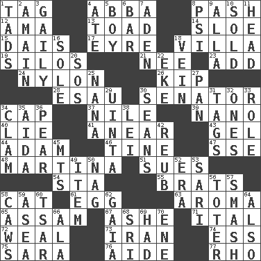 ACROSS 1. Label 4. Swedish rock group 8. Romantic infatuation 12. Housemaid (var.) 13. Frog relative 14. _ gin 15. Raised platform 17. Jane of fiction 18. Country residence 19. Grain storage towers 21. Born 23. Find the sum of 24. Thermoplastic polyamide 26. Monetary unit of Laos 28. He sold his birthright 30. Legislator 34. Head covering 37. The longest river in the world 39. Billionth: prefix 40. Falsehood 41. Approach 43. Set 44. First of billions? 46. Prong on a fork 47. Compass dir. 48. Chrissie's court nemesis 51. Takes to court 54. R.R. building 55. Naughty children 58. Feline 61. Oval reproductive body of a fowl 63. Odor 65. Indian state 67. American tennis player Robert 71. Slanted text style (abbr.) 72. Welt 73. SW Asia republic 74. Double-curved letter 75. "Two Mules for Sister ____" 76. Helper 77. 17th letter of the Greek alphabet DOWN 1. Small boys 2. At full speed 3. Lightheartedly 4. Had dinner 5. Male child 6. Oblong piece of solid material 7. An important port of Yemen 8. 23rd letter of the Greek alphabet 9. Silent film actress Nazimova 10. Exchanged or delivered for money 11. Froth on beer 16. Flatfish 18. Distinctive style or manner 20. Distress signal 22. Supplement with great effort 25. Grandmother 27. Baking dish 29. National forest in Provo, Utah 30. Actors Connery and Penn 31. Labels 32. Washington bills 33. Hero or heavy, e.g. 34. Burrowing marine mollusk 35. Opera by Verdi 36. Lightbulb-shaped fruit 38. Flowery wreath 42. Reuben's nickname 45. Mountains (abbr.) 49. A distinct part 50. Tired old horse 52. Epoch 53. Indian skirt 56. Carrier 57. Box-office sellout 58. Crow sounds 59. Toward the sea 60. Russian ruler of old 62. Greek goddess of the earth (variant) 64. In addition 66. Insect wing 68. Indian title of respect (Mr.) 69. Possessed 70. Compass dir.