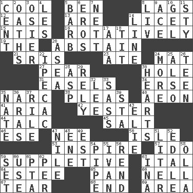 ACROSS 1. Calm and collected 5. Benjamin's nick name 8. Straggles 12. Relaxation 13. "We ___ not amused" (Victoria) 14. It is permitted: Lat. 15. Nuclear Threat Initiatives 16. Happening in regular succession 19. Definite Article 20. Refrain by choice 21. Indian titles of respect 23. Had dinner 24. Floor protector 27. Lightbulb-shaped fruit 30. Hollow 31. Artist's stands 34. Celtic language 35. Drug cop 38. Entreaties 40. Period of immesurable duration 41. Operatic vocal solo 42. Next before 44. Baby powder 45. Table seasoning 46. Compass dir. 47. Born 50. Capri or Wright 53. Stimulate to action 57. Wedding promise 59. Supplementary 63. Slanted text style (abbr.) 64. First name in cosmetics 65. Baking dish 66. 1994 drama film starring Jodie Foster 67. Lacerate 68. Conclusion 69. Length times width DOWN 1. Penny 2. Curses 3. Flexible twig of a willow tree 4. French article 5. Sharp remark 6. Greek god of love 7. Remaining after all deductions 8. 54 in ancient Rome 9. Adept person 10. Set 11. Filthy place 14. Actor's bit 17. American Automobile Association (abbr.) 18. Teat (slang) 20. Toward the sea 22. Medicinal drug used to evoke vomiting 24. Greater amount 25. In addition 26. Adolescent 28. Cleo's killer 29. Have trust in 30. Centers of feelings and intuitions 32. Area sheltered from the wind 33. Backtalk 35. Nathan's nickname 36. Ancient river in northeast Turkey 37. Cause heat under the collar 39. R.R. building 43. Writer Wiesel 47. The longest river in the world 48. Compass dir. 49. Eastern Standard Time (abbr.) 51. 61 cubic inches 52. Peak District village in England 54. Corncob 55. "Terrible" tsar 56. Tear apart 58. Water jar 59. Arrange properly for use 60. Purpose 61. Parent Teacher Association (abbr.) 62. For each 63. _ tizzy (2 wds.)