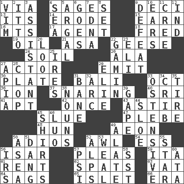 ACROSS 1. By way of 4. Gurus 9. Tenth: prefix 13. It is 14. Eat (away) 15. Merit 16. Mountains (abbr.) 17. Rep 18. Flintstone 19. Lubricate 21. White ___ sheet 22. Honkers 24. Land 26. Wing 27. Thespian 29. Send forth 30. Food holder 31. Indonesian resort city 33. Sep. follower 36. Electrically charged atom 37. Catching in a trap 40. Indian title of respect (Mr.) 41. Fitting 42. Single time 43. Moving or stirring 45. Turn sharply 47. First-year military academy student 48. Attila the _ 49. A really long time 50. Goodbye (Sp.) 52. Leather borer 54. Curvy letter 56. Austrian river, tributary to the Danube 57. Entreaties 59. Call ___ day 61. Monthly bill 62. Arguments over trivial matters 63. Large container 64. Sinks 65. Small island 66. Period DOWN 1. Zeal 2. "Tell ____ the Marines!" 3. Aide 4. Ocean 5. Therefore, facetiously 6. Moves 7. Pulitzer Prize-winning author Ferber 8. Arrange properly for use 9. Outscore 10. Hearing organs 11. Algonquian 12. Working for oneself (abbr.) 20. Plunder 22. Street urchin 23. Connecticut Ivy Leaguer 25. Angers 27. Capital of Western Samoa 28. Hoof sound 29. Writer Wiesel 31. Object of repulsion 32. Curve 33. Clearly or manifestly demonstrative 34. Baby bed with high sides 35. Become fatigued 38. Parts of speech 39. Open wide 44. A type of plum 45. Chest coverings 46. Nilotic language 49. Having winglike extensions 50. Toward the sea 51. Mild oath, euphamism for damn 52. High mountains 53. Welt 55. Play the lead 56. Big collection agency 57. Air pressure measure (abbr.) 58. Fast jet (abbr.) 60. "One Day ___ Time"
