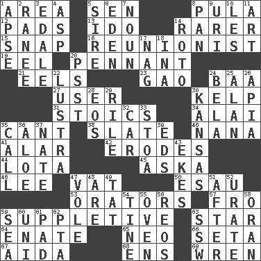 ACROSS 1. Type of rug 5. Elected rep. 8. Monetary unit of Botswana 12. Groovy apts. 13. Wedding promise 14. Less widely known 15. Fastener 16. One who advocates reunion 19. Snakelike fish 20. Pre-World Series prize 21. Snakelike fish 23. E Mali city 24. Sound made by sheep 27. One who uses or employs something 30. Seaweed 31. Unemotional ones 34. Mountain range southwest of Kyrgyzstan 35. Patter 38. Schedule 40. Nanny 41. Having or resembling wings 42. Eats (away) 44. Globular water bottle used in Asia 45. "____ silly question..." 46. Area sheltered from the wind 47. Large container 50. Son of Isaac 53. Speakers 57. Back 59. Supplementary 63. Play the lead 64. Maternal 65. Modern: prefix 66. Stalk of a moss capsule 67. Opera by Verdi 68. Followers of ems 69. Songbird DOWN 1. Domed church section 2. The wife of a rajah (variant) 3. Peak District village in England 4. Cleo's killer 5. The founder of a family 6. Genesis locale 7. Part of speech 8. Baking dish 9. RI univ. 10. French article 11. Nonscientific branch of learning 14. Printing process, for short 17. Tired old horse 18. _ tizzy (2 wds.) 20. Inconspicuous attention getter 22. A period of five years 24. Actor Lugosi 25. ____ Jay Lerner 26. Capital of Western Samoa 28. Greek goddess of the dawn 29. Cause heat under the collar 30. Sunflower state 32. Auto 33. Portico 35. Give a ring to 36. Medicinal plant 37. Nathan's nickname 39. Begley and Asner 43. Supplements with great effort 47. Short-tailed, large-bodied rat 48. "We ___ not amused" (Victoria) 49. Make lace 51. Following 52. A salt of uric acid 54. Prong on a fork 55. Baking chamber 56. Vintage cars 58. Northwest Algerian city 59. Ocean 60. Corn or form start 61. Writing tablet 62. Parent Teacher Assoc. 63. Compass dir.