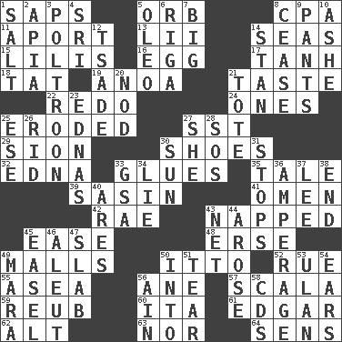 ACROSS 1. Plant excrements 5. Globe 8. Accounting whiz (abbr.) 11. To the left, to Queeg 13. Cards in a Roman deck? 14. Oceans 15. Ms. Damita and namesakes 16. Ovum 17. Hyperbolic tangent 18. Make lace 19. Small Philippine buffalo 21. Clothes sense 22. Redecorate 24. Washington bills 25. Worn away 27. Fast jet (abbr.) 29. The Jewish people; Israel 30. Imelda's hoard 32. Pulitzer Prize-winning author Ferber 33. Adhesives 35. Story 39. Indian antelope 41. Presage 42. Actress Charlotte 43. Slept 45. Relaxation 48. Celtic language 49. Promenades 50. "Tell ____ the Marines!" 52. Sorrow 55. At sea 56. A saturated hydrocarbon 57. Any of the three canals of the cochlea 59. Reuben's nickname 60. Call ___ day 61. _ Allan Poe 62. Keyboard modifier key 63. And not 64. Elected reps. DOWN 1. Table seasoning 2. Capital of Western Samoa 3. Characterized by complete cowardliness 4. _ Lanka 5. Margarine 6. Port city in Latvia 7. Large 8. Desist 9. Leg coverings 10. American tennis player Robert 12. Sadhe (variant) 14. Comedian Laurel of Laurel & Hardy 20. Dreamland 21. Haul 23. Ferber et al. 25. Compass dir. 26. To free from 27. A female animal or person 28. Mayday 30. Player for Phoenix 31. Closes up, plugs up 33. Girls' org. (abbr.) 34. Falsehood 36. Electrical Measurement 37. Area sheltered from the wind 38. Conclude 40. Ancient Greek god of war 43. Fish or hair follower 44. Came up 45. Artist's stand 46. Eskimo relative 47. Thick slice 49. Hindu Mythology: god of death 50. To the inside or interior of 51. Pull into pieces 53. ____ Bator, Mongolia 54. Hearing organs 56. The 18th letter of the Arabic alphabet 58. Music discs