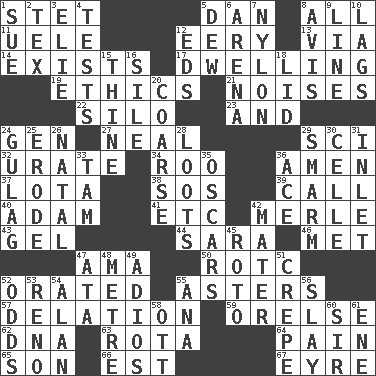 ACROSS 1. Proofreading order 5. One of the 12 tribes of Israel 8. 100% 11. Ubangi River tributary 12. Suggestive of the supernatural 13. By way of 14. Is 17. Home 19. Moral principles 21. Annoying sounds 22. Grain storage tower 23. Added to 24. Commissioned mil. rank 27. Actress Patricia 29. _-fi 32. A salt of uric acid 34. Friend of Pooh 36. So be it 37. Globular water bottle used in Asia 38. Mayday 39. Give a ring to 40. First man 41. And so on (abbr.) 42. Haggard of country music 43. Set 44. "Two Mules for Sister ____" 46. Was introduced to 47. Nursemaid (var.) 50. College mil. group 52. Declaimed 55. Michaelmas daisies 57. Accusation by an informer 59. Threatening words 62. Heredity factor (abbr.) 63. Roll call or roster of names 64. Ache 65. Male offspring 66. Eastern Standard Time (abbr.) 67. Jane of fiction DOWN 1. Take to court 2. John Ritter's dad 3. Writer Wiesel 4. Trials 5. Morning condensation 6. Sports stadium 7. Thermoplastic polyamide 8. Deliberation 9. Actor's bit 10. Straggles 12. Begley and Asner 15. One or ones belonging to thee 16. Drop; flow; fall 18. Hat (slang) 20. Unrefined 24. Russian prison camp 25. Eat (away) 26. Relating to or accompanying birth 28. Plunders 29. Excessive but superficial compliments 30. Cell (Danish) 31. An arm off of a larger body of water 33. Scottish cap 35. Motion picture awards 36. Adept person 42. Mother 45. Printing process, for short 47. _ moment's notice (2 wds.) 48. Distance measurement (Brit.) 49. Goodbye (Sp.) 51. Streamer paper 52. Likelihood 53. Western Nevada city 54. ____ Jay Lerner 55. Santa ___, CA 56. Kill 58. Baseball player Mel 60. Title for a knight 61. Compass dir.