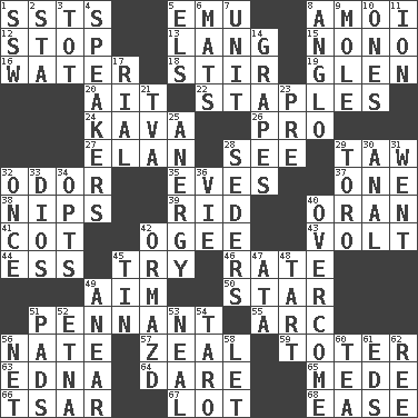 ACROSS 1. Fast planes 5. Australian flightless bird 8. Mine, in Marseilles 12. Close up, plug up 13. Austrian-born American filmmaker Fritz 15. Words to Nanette 16. Wetness 18. Tumult 19. Small, secluded valley 20. Small island 22. Paper fasteners 24. Polynesian shrub of the pepper family 26. Adept person 27. Enthusiasm 28. Perceive with the eye 29. The 23rd letter of the Hebrew alphabet 32. Scent 35. Nights before holidays 37. Single 38. Pinches, bites 39. To free from 40. NW Algerian seaport 41. Small bed 42. Double curve, resembling the letter S 43. Electrical Unit 44. Double-curved letter 45. Attempt 46. Pace 49. Direct toward a target or goal 50. Play the lead 51. Pre-World Series prize 55. Curve 56. Nathan's nickname 57. Ardor 59. Carrier 63. Pulitzer Prize-winning author Ferber 64. Have the gumption 65. Ancient Persian 66. Russian ruler of old 67. Car dealer's back yard 68. Comfort DOWN 1. Compass dir. 2. R.R. building 3. Small child 4. Orators 5. Raised railways 6. Floor protectors 7. A single undivided whole 8. White American of non-Hispanic descent 9. Undercover agent 10. Washington bills 11. Electrically charged atom 14. Wine fruits 17. Monetary unit of Yemen 21. Federal power corp. 23. Before (prefix) 25. Disorder of the immune system 28. Spring feasts 29. "Corrida" creature 30. Of or related to the anus 31. Left 32. Single time 33. "Vaya con ____" 34. Chooses 36. Compete 40. Conquer 42. Chief deity of Zoroastrianism 45. Metal container 47. "One Day ___ Time" 48. Small pie 49. Approach 51. Groovy apts. 52. Inactive volcano in Sicily 53. Anneal 54. Pacific island yam 56. Fish or hair follower 58. Allow 60. Afternoon social gathering 61. Begley and Asner 62. To riddle