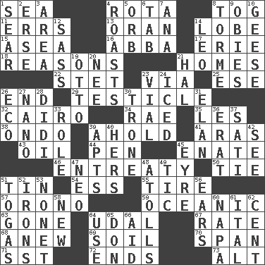 ACROSS 1. Ocean 4. Round or rotation of duties 8. Coat; cloak 11. Blunders 13. NW Algerian seaport 14. Ear part 15. Toward the sea 16. Swedish rock group 17. One of the Great Lakes 18. Thinks logically 21. Residences 22. Proofreading order 23. By way of 25. Compass dir. 26. Conclusion 29. One of the two male reproductive glands 32. Capital of Egypt 34. Actress Charlotte 35. French article 38. Southwest Nigerian state 39. Hold, grip (Informal) 41. Ancient river in northeast Turkey 43. Lubricate 44. Animal enclosure 45. Maternal 46. Plea 50. Make a knot 51. Metal container 54. Curvy letter 55. Hoop that covers a wheel 57. U. of Maine site 59. Pertaining to the sea 63. Went 64. Hereditary estate 67. Assign a rank or rating to 68. Afresh 69. Land 70. Connect, as a bridge 71. Fast jet (abbr.) 72. Extremities 73. Keyboard modifier key DOWN 1. Dry up 2. Celtic language 3. Length times width 4. Cooks with dry heat, as in an oven 5. Globe 6. Bar bill 7. Santa ___, CA 8. Singer Mel 9. Off-Broadway awards 10. Honkers 12. Backtalk 14. Lion 19. Von Bismarck 20. Born 21. Actor Linden 23. Small bottle 24. On the rocks 26. Environmental prefix 27. Billionth: prefix 28. "You Light Up My Life" star Conn 30. Marketplace scale 31. Style 33. Hero or heavy, e.g. 36. Part of Q.E.F. 37. Suttee (variant) 39. Tenement units (abbr.) 40. Possessive pronoun 42. Perceive with the eye 45. Jane of fiction 47. Modern: prefix 48. Ringlike coral islands and reefs 49. Nervous spasm 51. Ancient Roman robes 52. Metal shackles 53. Music written for nine 56. Hearing organs 58. ___ Haven, CT 60. California wine valley 61. Slanted text style (abbr.) 62. Penny 64. Purpose 65. Spanish title 66. Assist