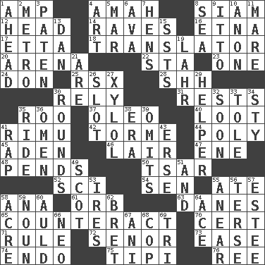 ACROSS 1. Electrical Unit 4. Nanny 8. Thailand, formerly 12. Froth on beer 14. All-night dance parties 16. Inactive volcano in Sicily 17. Singer James 18. Interpreter 20. Sports stadium 22. R.R. building 23. Single 24. Spanish title 25. Acura sports coupe 28. Quiet! 30. Have confidence or faith in 31. Musical pauses 35. Friend of Pooh 37. Butter sub 40. Plunder 41. Tall New Zealand timber tree 42. Singer Mel 44. Many (prefix) 45. An important port of Yemen 46. Den 47. Compass dir. 48. Hangs 50. Russian ruler of old 52. _-fi 54. Elected rep. 55. Had dinner 58. Santa ___, CA 61. Globe 63. Natives or inhabitants of Denmark 65. Neutralize 70. Certainty 71. Court order 72. Sir (Sp.) 73. Comfort 74. Inside; within (prefix) 75. Native american tent (variation) 76. To sift DOWN 1. Having the leading position 2. Paris' subway 3. Eucharist need 4. Tate display 5. Impair 6. Actress Gardner 7. Coop moms 8. Ocean 9. "Tell ____ the Marines!" 10. Soon (poet.) 11. Female horse 13. One of the 12 tribes of Israel 15. Fast planes 19. Cowardly lion portrayer 21. "We ___ not amused" (Victoria) 26. Narrow, elongated depression 27. Xylene (variant) 29. Aide 30. Periods in a boxing match 32. Within a short period 33. Lacquered or enameled metalware 34. Filthy place 35. Travel on or in a vehicle 36. Sign of things to come 38. Epoch 39. Leaves out 41. Reproach for some lapse or misdeed 43. Celtic language 49. Highlander 51. Added to 53. Angers 55. Approach 56. Laconic 57. First name in cosmetics 58. 1/640 square mile 59. Part of speech 60. Old (Scot.) 62. Cy Young winner Saberhagen 64. Adept person 66. Modern: prefix 67. Black tropical American cuckoo 68. Police officer (slang) 69. Three (prefix)