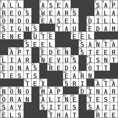 ACROSS 1. Everything 4. Toward the sea 8. Plant excrement 11. Vintage cars 13. Puts on (as clothing) 15. Insect wing 16. Southwest Nigerian state 17. Artist's stand 18. Deli pickle 19. Omens 21. The 19th letter of the Greek alphabet 22. Dutch treat 23. Compass dir. 24. Shoshoni 27. Snakelike fish 29. Sew up the eyelids of hawks and falcons 30. Before Barbara or Clara 34. Fitting 36. Paradise 39. Bull 40. One who doesn't tell the truth 41. Congenital growth or mark on the skin 43. Is not 44. Ferber et al. 46. Do over again 47. Baseball player Mel 48. Trials 49. Merit 51. John Ritter's dad 53. _ Lanka 54. "One Day ___ Time" 57. Words to Nanette 60. Atlas unit 63. Middle Eastern gold or silver currency 65. NW Algerian seaport 66. Place in a line 69. Trial 70. Declare 71. Settings 72. Suttee (variant) 73. Raised railways 74. Not this but _ 75. To riddle DOWN 1. Came up 2. Soviet premier 1918-24 3. Cabin 4. Deep reverence 5. Ocean 6. Compass direction 7. Type of rug 8. Stated 9. Silent film actress Nazimova 10. Inside of hand 12. Boy, to dad 14. Turn sharply 18. Conveyance 20. Take to court 25. Adolescent 26. A person who is older than you are 28. Curvy letter 29. Ski resort town in Vermont 31. A home for chicks 32. Portable shelter 33. Nonscientific branch of learning 34. Helper 35. Baking dishes 37. Night before a holiday 38. Unclothed pictures 40. Allow 42. Fly high 45. Compass dir. 50. To free from 52. Dec. holiday 54. Approach 55. Clothes sense 56. Nick name for Arthur 57. Characteristic smell of wine 58. Relating to the mouth 59. Negative votes 61. Set down 62. Heart or essence 64. ___ a Wonderful Life 67. Teachers' org. 68. Eastern Standard Time (abbr.)