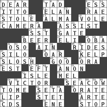 ACROSS 1. Letter starter 5. Bit 8. Curvy letter 11. "Tell ____ the Marines!" 12. Enthusiasm 14. Actress Charlotte 15. Took without asking 17. _ mater 18. Short-tailed, large-bodied rat 19. Device for capturing images 21. Aid 23. Fast jet (abbr.) 25. Yard entry 26. Fermented drink made from hops 27. Biblical high priest 28. Chief or king in Benin or Nigeria 31. Bear (Spanish) 33. The 18th letter of the Arabic alphabet 35. Amusement-park features 37. Grain storage tower 38. Rowing implement 40. Seaweed 41. Splash clumsily 43. Thick or sticky substance 45. Mouth or opening 46. Eastern Standard Time (abbr.) 47. Newt 50. At once, immediately (arch.) 52. Capri or Wright 53. Cartoonist voice _ Blanc 54. Winning man's name 56. Manatee 61. Heavy book 62. Stalk of a moss capsule 65. Speak pompously 66. Mouth edge 67. Proofreading order 68. Johnson of "Laugh-In" 69. Music discs 70. Compass dir. 71. Halt DOWN 1. Flat circle 2. Singer James 3. Smallest unit of an element 4. Hero or heavy, e.g. 5. Afternoon social gathering 6. Everything 7. Break 8. Greek god of love 9. Table seasoning 10. Perceive with the eye 13. Relating to the nose 16. Celtic language 18. Compete 20. At sea 22. Agitate 24. Musical group of three 26. Scornful sounds 28. River in Europe 29. Actor Lugosi 30. Viper 31. Lubricates 32. Slit 34. Tired old horse 36. Visual representation of an object 37. Compass dir. 39. Wander aimlessly 42. Command 44. Singles 48. Soft thread for cleaning between teeth 49. Cigar-shaped 51. Margarine 52. Frozen water 54. Lacking any legal or binding force 55. Naughty children 57. Caspian sea tributary 58. Draw slowly or heavily 59. "Beetle Bailey" pooch 60. Shed a tear 61. Affectionate concern, for short 63. "___ Little Indians" 64. Had dinner