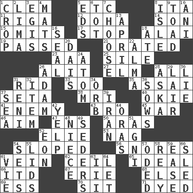 ACROSS 1. To starve (Brit.) 5. And so on (abbr.) 8. Call ___ day 11. Capital of Latvia 12. Capital of the state of Qatar 14. Male child 15. Leaves out 17. Obstruct or block passage 18. Jai _ 19. Went by 21. Spoke pompously 23. American Automobile Association (abbr.) 25. Drop; flow; fall 26. Came down and settled, as after flight 27. Shade tree 28. Everything 31. To free from 33. "Barney Miller" actor Jack 35. Slender Brazilian palm 37. Bristle 38. Medical imaging device (abbr.) 40. Migrant worker of the '30s 41. Foe 43. Sis' sibling 45. Armed conflict 46. Direct toward a target or goal 47. Followers of ems 50. Caspian sea tributary 52. Writer Wiesel 53. Tired old horse 54. Inclined 56. Sounds asleep 61. Distinctive style or manner 62. To provide with a ceiling 65. Standard of perfection 66. It would 67. One of the Great Lakes 68. Otherwise 69. Curvy letter 70. Be seated 71. Colored DOWN 1. Riding implement 2. Pale green bean 3. Armor plate that protects the chest 4. Floor coverings 5. Begley and Asner 6. Small child 7. Opt 8. Small island 9. Frog relative 10. Cuckoo 13. Showery time 16. Lick closed 18. Had dinner 20. Raised platform 22. _ mater 24. Smallest unit of an element 26. First man 28. "____ silly question..." 29. Den 30. Whopper 31. Painter Guido (1575-1642) 32. A whole individual unit 34. Globe 36. Sty mamas 37. Ocean 39. SW Asia republic 42. Sharp bark 44. Mouths or openings 48. Sibling's daughter 49. Spring feasts 51. Hindu god of fire 52. Period of immesurable duration 54. Arranges properly for use 55. Hats (slang) 57. Wrote a lyric poem 58. Depend 59. Relaxation 60. Downhill vehicle 61. Compete 63. One more than two 64. Allow