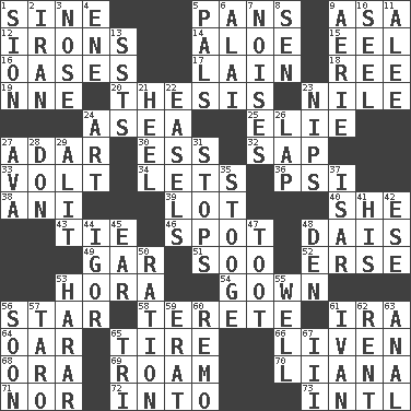 ACROSS 1. Trig term 5. Zero-star reviews 9. White ___ sheet 12. Metal shackles 14. _ vera 15. Snakelike fish 16. Fertile tracts in a desert 17. (Had) reclined 18. Portuguese money of account (variant) 19. Compass dir. 20. College paper 23. "Death on the ____" 24. At sea 25. Writer Wiesel 27. The sixth month of the Jewish calendar 30. Curvy letter 32. Plant excrement 33. Electrical Unit 34. Allows 36. 23rd letter of the Greek alphabet 38. Black tropical American cuckoo 39. Car dealer's back yard 40. A female animal or person 43. Neckwear 46. Blemish 48. Raised platform 49. Slender fish 51. "Barney Miller" actor Jack 52. Celtic language 53. Israeli folk dance 54. Bride's dress 56. Play the lead 58. Cigar-shaped 61. Lyricist Gershwin 64. Boat paddle 65. Become fatigued 66. Make or become more lively 68. Mouth or opening 69. Wander 70. Woody, climbing, usually tropical plant 71. Not either 72. To the inside or interior of 73. International (abbr.) DOWN 1. The Jewish people; Israel 2. SW Asia republic 3. Olfactory organ 4. Compass dir. 5. Friends 6. Jai ____ 7. Annoying sounds 8. Elected rep. 9. Nest on high 10. Stitch closed the eyes of (a falcon) 11. Toward shelter 13. Fast planes 21. Person who is morally reprehensible 22. Artist's stands 23. Cuts off 24. Tate display 26. Pet locale 27. Actress Gardner 28. Spanish title 29. Set down 31. Closes up, plugs up 35. Moe Howard, for one 37. Austrian river, tributary to the Danube 41. Part of HMS, perhaps 42. Compass dir. 44. Russian composer Stravinsky 45. Hearing organ 47. A blast of a horn 48. Lair 50. Food allowance for one day 53. Ethiopian city, capital of Harari 55. Not ill 56. Within a short period 57. Edible starchy tuberous root 59. Part of Q.E.F. 60. San ____ (Riviera town) 61. "Terrible" tsar 62. Monthly bill 63. Of or related to the anus 65. Three (prefix) 67. One more than two