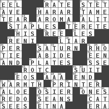 ACROSS 1. Snakelike fish 4. Pace 8. Proofreading order 12. "___ Maria" 13. Ethiopian city, capital of Harari 14. Not wild 15. Pull into pieces 17. Scent 18. Came down and settled, as after flight 19. Paper fasteners 21. Cylindrical with tapered ends 23. Part of HMS, perhaps 24. To riddle 26. French article 27. Painter Guido (1575-1642) 28. One who doesn't tell the truth 30. For each 31. Titan orbits this 34. 17th letter of the Greek alphabet 37. Standoff 38. Tolerate 39. Car or cant ending 40. Also 41. Food holders 42. Compass dir. 43. College mil. group 44. Set or collection 46. Greek goddess of the dawn 47. Auto club (abbr.) 50. Conclusion 51. Heat 54. Hard copy producer 57. _ vera 58. Flexible twig of a willow tree 60. Singles 62. Make new 63. Seines 64. Feline 65. Perceives with the eye 66. Inactive volcano in Sicily 67. Epoch DOWN 1. Erode 2. Nights before holidays 3. Tough but pliablecoriaceous 4. More uncommon 5. Came up 6. Scottish cap 7. Part of Q.E.F. 8. A viewer who gazes fixedly 9. Lies 10. Send forth 11. Wig 13. Actor Linden 16. Precipitation 20. 23rd letter of the Greek alphabet 22. Flair 25. Dodge 27. It's straight from the horse's mouth 29. Angers 30. Parent Teacher Assoc. 31. Table seasoning 32. Phillipine bananalike plant 33. Teat (slang) 34. Home 35. Command 36. Single 41. Mail 43. Lover boys 44. Elected rep. 45. To (old English) 46. Wear away 48. Bee-related 49. Sports stadium 51. Armed conflicts 52. Toward shelter 53. Stockings 55. Big collection agency 56. Posterior 59. Arrange properly for use 61. R.R. building
