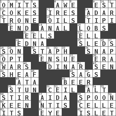 ACROSS 1. Leaves out 6. Deep reverence 9. Eastern Standard Time (abbr.) 12. Popular sodas 13. Angers 14. The sixth month of the Jewish calendar 15. Marketplace scale 16. Lubricates 17. Native american tent (variation) 18. Conclude 19. Of or related to the anus 20. Tennis shots 21. Snakelike fish 23. Pipe bend 24. Pulitzer Prize-winning author Ferber 25. Bobsleighs 28. Male offspring 30. Staphylococcus 34. Fastener 35. Choose 36. Take place subsequently 38. Epoch 39. Armed conflicts 41. Middle Eastern gold or silver currency 43. Elected rep. 44. Bundle of cut stalks of grain 46. Sinks 48. _ moment's notice (2 wds.) 49. Fermented drink made from hops 50. Make senseless or dizzy 51. To provide with a ceiling 53. The first octave above the treble staff 56. Use a spoon 57. Opera by Verdi 58. Soup utensil 60. Peachy ____! 61. Nuclear Threat Initiatives 62. Cell (Danish) 63. It is 64. Sight organ 65. Small island DOWN 1. Sep. follower 2. Greater amount 3. Image 4. Watched over 5. Compass dir. 6. Operatic vocal solo 7. Water source 8. Double-curved letter 9. The property of being fit to eat 10. Plant excrements 11. Three (prefix) 13. Charged particles 14. Ringlike coral islands and reefs 19. Having winglike extensions 20. French article 22. Followers of ems 24. Pleas 26. Have the gumption 27. Connect, as a bridge 28. Sty mamas 29. Brightly colored fish 31. Plus 32. Air pressure measure (abbr.) 33. Attila the _ 37. Artist's stand 40. Titan orbits this 42. Actress Charlotte 45. Avid follower 47. Raisin fruits 49. Prejudice 50. Proofreading order 51. Municipality 52. Singer Brickell 54. Hang loosely or laxly 55. Lacquered or enameled metalware 56. What Jean-Claude Killy likes to do 57. One (Scot) 58. _-fi 59. Fish or hair follower