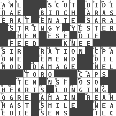 ACROSS 1. Leather borer 4. Highlander 8. "You Light Up My Life" star Conn 12. Actress Charlotte 13. A tree used for making furniture 14. Caspian sea tributary 15. Part of Q.E.F. 17. Maternal 18. "Two Mules for Sister ____" 19. Slender, wiry 21. Next before 23. Layer 24. Compass dir. 26. Pass on 27. Nourish 28. Leg joint 30. Title for a knight 31. Food allowance for one day 34. Accounting whiz (abbr.) 37. Single 38. Make improvements or corrections to 39. Petroleum 40. Lower and raise head in agreement 41. Break 42. Cartoonist voice _ Blanc 43. "Corrida" creature 44. Balmoral and tarboosh 46. Nine, plus one 47. Science/research agcy. 50. Bear (Spanish) 51. Centers 54. Yearning 57. Legendary monster 58. At full speed 60. 480, 500 or 516 sheets of paper 62. Vertical spar for supporting sails 63. Grin 64. Teachers' org. 65. Singer Brickell 66. Elected reps. 67. Affectionate concern, for short DOWN 1. "We ___ not amused" (Victoria) 2. Armed conflicts 3. Resembling or made to resemble leather 4. Scorch 5. Trading vessels 6. Sep. follower 7. Those people 8. Hyrax 9. Feeling or showing extreme anger 10. Have the gumption 11. Austrian river, tributary to the Danube 13. Benjamin's nick name 16. Family _ (genealogy) 20. Working for oneself (abbr.) 22. Genesis locale 25. Supplementing with great effort 27. A pale, very dry sherry 29. Thickened enlargement 30. Male child 31. Rump 32. ID or VA city 33. Beverage made from leaves 34. Part 35. Sliced desserts 36. 100% 41. Do not 43. Cigar-shaped 44. Gear tooth 45. SW Saudi Arabia district 46. Tarsus (plural) 48. Killed 49. Fencing necessities 51. Dwelling 52. Mild oath 53. Backtalk 55. Compass dir. 56. Highlander 59. Madame (abbr.) 61. Big _
