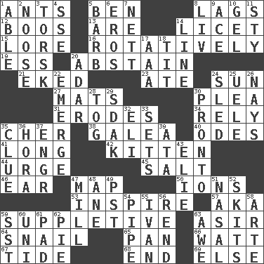 ACROSS 1. Pismires 5. Benjamin's nick name 8. Straggles 12. Expressions of contempt or scorn 13. "We ___ not amused" (Victoria) 14. It is permitted: Lat. 15. Old wives' tales, e.g. 16. Rotating or pertaining to rotation 19. Double-curved letter 20. Refrain by choice 21. Made supply last 23. Had dinner 24. Player for Phoenix 27. Floor coverings 30. Entreaty 31. Eats (away) 34. Have confidence or faith in 35. "Mermaids" star 38. An organ shaped like a helmet 40. Lyric poems 41. Having great length 42. Baby cat 44. Goad 45. Table seasoning 46. Ewer handle 47. Atlas unit 50. Charged particles 53. Stimulate to action 57. Alias (abbr.) 59. Supplementary 63. SW Saudi Arabia district 64. Slow-paced one 65. Baking dish 66. Electrical Unit 67. Periodic rise and fall of the sea level 68. Conclusion 69. Otherwise DOWN 1. Competent 2. Trap for birds or small mammals 3. Cod relative 4. Compass dir. 5. Sharp remark 6. Greek god of love 7. Remaining after all deductions 8. 54 in ancient Rome 9. Adept person 10. Set 11. Filthy place 14. Actor's bit 17. Auto club (abbr.) 18. Teat (slang) 20. The sixth month of the Jewish calendar 22. Develop 24. Downhill vehicle 25. Ubangi River tributary 26. Negative votes 28. Coat; cloak 29. Neighbor of Neb. 30. Right away 32. Connecticut Ivy Leaguer 33. Puts into a specified state 35. A slight indication 36. Israeli folk dance 37. Engineer (abbr.) 39. "One Day ___ Time" 43. Writer Wiesel 47. Place where flour is made 48. One (Scot) 49. Pacific Standard Time (abbr.) 51. Rhinal 52. Burlesque acts 54. Corncob 55. "Terrible" tsar 56. Tear apart 58. Johnson of "Laugh-In" 59. Fast jet (abbr.) 60. Single; one (prefix) 61. Writing tablet 62. Sliced dessert 63. Deep reverence