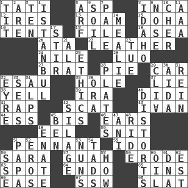 ACROSS 1. Jacques of French films 5. Viper 8. South American Indian 12. Angers 13. Wander aimlessly 15. Capital of the state of Qatar 16. Portable shelters 18. Do some clerical work 19. At sea 20. "One Day ___ Time" 22. Cordwainer's material 24. The longest river in the world 26. Nilotic language 27. Naughty child 28. Sliced dessert 29. Automobile 32. He sold his birthright 35. Hollow 37. Falsehood 38. Shout 39. Lyricist Gershwin 40. "You Light Up My Life" star Conn 41. Hit sharply and swiftly 42. Scram! 43. "Terrible" tsar 44. Curvy letter 45. Altar cloth linen 46. Hearing organs 49. Snakelike fish 50. In a ____ (agitated or irritated) 51. Pre-World Series prize 55. Wedding promise 56. "Two Mules for Sister ____" 57. Island territory of the United States 59. Eat (away) 63. Specific locale 64. Inside; within (prefix) 65. Canisters 66. Comfort 67. Compass dir. 68. Narrow board DOWN 1. Teat (slang) 2. "We ___ not amused" (Victoria) 3. "___ Little Indians" 4. Byzantium, centuries later 5. Sandy's bark 6. The visible part of the earth's surface 7. Light colored 8. Potato state 9. Olfactory organ 10. "Mermaids" star 11. Auto club (abbr.) 14. Ear of corn 17. Commotion 21. Insect wing 23. Third day of the wk. 25. Moral principles 28. Food holders 29. 154 in Roman numerals 30. Opera by Verdi 31. It's straight from the horse's mouth 32. Jane of fiction 33. Oceans 34. High mountains 36. Mouth or opening 40. What propaganda does 42. Fodder prepared in a silo 45. Benjamin's nick name 47. Cuckoo 48. Travel on an animal 49. Maternal 51. Dad 52. Greek god of love 53. Religious women 54. Small amounts or degrees 56. Compass dir. 58. Cut the grass 60. Lubricate 61. Heredity factor (abbr.) 62. Eastern Standard Time (abbr.)