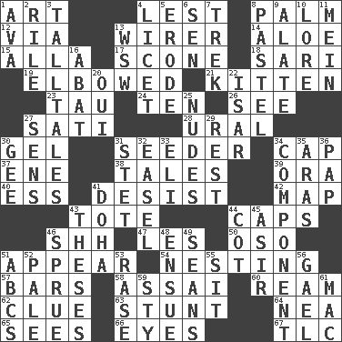 ACROSS 1. Tate display 4. For fear that 8. Inside of hand 12. By way of 13. One who wires 14. Medicinal plant 15. Silent film actress Nazimova 17. Biscuitlike quick bread 18. Indian skirt 19. Shoved, as through a crowd 21. Baby cat 23. The 19th letter of the Greek alphabet 24. "___ Little Indians" 26. Perceive with the eye 27. Suttee (variant) 28. Mountain range 30. Set 31. Sowing specialist 34. Head covering 37. Compass dir. 38. Falsehoods 39. Mouth or opening 40. Curvy letter 41. Cease 42. Atlas unit 43. Lug 44. Balmoral and tarboosh 46. Quiet! 47. French article 50. Bear (Spanish) 51. Become visible 54. Inhabiting a nest 57. Soap units 58. Slender Brazilian palm 60. 480, 500 or 516 sheets of paper 62. A slight indication 63. Difficult or unusual or dangerous feat 64. Teachers' org. 65. Observes 66. Sight organs 67. Affectionate concern, for short DOWN 1. Actress Gardner 2. Cause heat under the collar 3. Baron Munchausen's specialties 4. It is permitted: Lat. 5. Eat (away) 6. Elected rep. 7. Long journey 8. Soft color 9. Having winglike extensions 10. Old wives' tales, e.g. 11. Chow _ 13. Compass dir. 16. Blind as ____ 20. Fr. "Yes" 22. Austrian river, tributary to the Danube 25. Unadorned figures 27. Elected reps. 29. Remainder 30. Turn to the right 31. Proofreading order 32. Artist's stand 33. Connecticut Ivy Leaguer 34. Part 35. Caspian sea tributary 36. Infant food 41. Capital of the state of Qatar 43. College papers 44. Small bed 45. SW Saudi Arabia district 46. Disorder 48. Take place subsequently 49. Actors Connery and Penn 51. Lettered men learn these first 52. Light colored 53. Raze (variant) 55. Be seated 56. Highlander 59. Filthy place 61. Apple computer (short form)