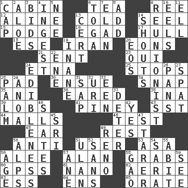 ACROSS 1. Apartment or room in a ship 6. Afternoon social gathering 9. Portuguese money of account (variant) 12. Place in a line 13. Lacking warmth 14. Sew up the eyelids of hawks and falcons 15. Porridge 16. Mild oath 17. Frame or body of a ship 18. Compass dir. 19. SW Asia republic 20. Immeasurably long periods of time 21. Transmitted 23. Fr. "Yes" 24. Inactive volcano in Sicily 25. Discontinues 28. Groovy apt. 30. Follow as a consequence or result 34. Fastener 35. Cuckoo 36. Having ears or earlike features 38. _ tizzy (2 wds.) 39. Tennis shots 41. Abounding in pines 43. Fast jet (abbr.) 44. Promenades 46. Trial 48. Hearing organ 49. Remainder 50. Against 51. One who uses or employs something 53. White ___ sheet 56. Toward shelter 57. Actor Alda or Thicke 58. Catches 60. Global Positioning Systems (abbr.) 61. Billionth: prefix 62. Nest on high 63. Double-curved letter 64. Followers of ems 65. Speak pompously DOWN 1. Head covering 2. _ vera 3. Auction offers 4. Swallow 5. Born 6. Ancient Roman robe 7. Style 8. Find the sum of 9. One who advocates reunion 10. Snakelike fish 11. Pipe bend 13. Certainty 14. Yells 19. Lacking in sense or substance 20. Greek goddess of the dawn 22. Compass dir. 24. The property of being fit to eat 26. Zero-star reviews 27. Petty quarrel 28. Inside of hand 29. Small Philippine buffalo 31. Plant excrement 32. RI univ. 33. Car or cant ending 37. Prevent from occurring 40. Chalkboards 42. Affirmative reply 45. _ Lanka 47. A viewer who gazes fixedly 49. Former U.S. Attorney General Janet 50. High mountains 51. ____ Bator, Mongolia 52. Without 54. "Two Mules for Sister ____" 55. "This won't hurt ____!" 56. Grow older 57. A saturated hydrocarbon 58. E Mali city 59. Perceive with the eye