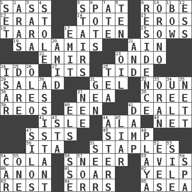 ACROSS 1. Backtalk 5. Petty quarrel 9. Loose flowing garment 13. Part of Q.E.F. 14. Carryall 15. Greek god of love 16. Edible starchy tuberous root 17. Eroded 18. Sty mamas 19. Deli grouping 21. The 18th letter of the Arabic alphabet 22. Arab leader 23. Southwest Nigerian state 24. Wedding promise 27. ___ a Wonderful Life 28. Event that recurs at intervals 29. Vegetable dish 31. Set 32. Part of speech 36. Ancient Greek god of war 37. Teachers' org. 38. Algonquian 39. Vintage cars 40. Car or cant ending 41. Started a card game 42. Small island 44. According to 46. Fish or hair follower 47. Fast planes 48. Simple or foolish person 50. Call ___ day 51. Paper fasteners 54. Root beer relative 56. Scornful expression 58. Advice 60. At once, immediately (arch.) 61. Fly high 62. Sharp bark 63. Repose 64. Blunders 65. Toward the sea DOWN 1. Arrange properly for use 2. Caspian sea tributary 3. "Two Mules for Sister ____" 4. Fur scarf 5. Flight of steps 6. Cooking vessels 7. Had dinner 8. "___ Little Indians" 9. Dwelling 10. U. of Maine site 11. Arrow shooter 12. Double-curved letter 17. Give off 20. Among 21. Also 23. Petroleum 24. Austrian river, tributary to the Danube 25. Have the gumption 26. Margarine 28. Afternoon social gathering 30. Helper 31. Commissioned military rank (abbr.) 33. Northwest Algerian city 34. Ubangi River tributary 35. Remaining after all deductions 37. Born 40. Raised railways 41. Moist 43. R.R. building 44. Michaelmas daisies 45. One who doesn't tell the truth 47. Grain storage towers 49. Beach, in Buenos Aires 51. Scorch 52. Nights before holidays 53. Filth; sediment 54. 4-wheeled motor vehicle 55. Single 56. Compass dir. 57. Not either 59. Health resort