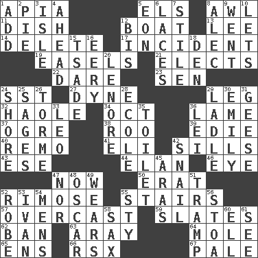 ACROSS 1. Capital of Western Samoa 5. Raised railways 8. Leather borer 11. Food container 12. Water vessel 13. Area sheltered from the wind 14. Keyboard key 17. Happening 19. Artist's stands 21. Chooses 22. Have the gumption 23. Elected rep. 24. Fast jet (abbr.) 27. Centimeter-gram-second unit of force 29. Part of a journey 32. White Person, in Hawaii 34. Sep. follower 36. Unable to walk 37. Legendary monster 38. Friend of Pooh 39. Singer Brickell 40. San ____ (Riviera town) 41. Connecticut Ivy Leaguer 42. Beverly of Met fame 43. Compass dir. 44. Flair 46. Sight organ 47. Immediately 50. Part of Q.E.F. 52. Full of chinks, cracks, or crevices 55. Flight of steps 57. Cloudy 59. Chalkboards 62. Bar 63. Like ___ of sunshine 64. Undercover agent 65. Followers of ems 66. Acura sports coupe 67. Diluted with white DOWN 1. Increase 2. Sliced dessert 3. Small island 4. At or in the front 5. Period of immesurable duration 6. Shoestrings 7. Vertical member of a panel or frame 8. Actor Baldwin 9. Left 10. Allows 12. Altar cloth linen 15. Sadhe (variant) 16. Suggestive of the supernatural 18. Lair 20. Poe poem 24. Dinah or Pauly 25. Gurus 26. Singer Mel 28. Learning spot: Fr. 29. Dipping utensil 30. Poet Dickinson 31. Honkers 33. Lion 35. Rest room 36. Flowery wreath 42. Slow-paced one 45. Caspian sea tributary 47. And not 48. Witty Wilde 49. Erodes 51. _____ steamer (cargo ship) 52. Loose flowing garment 53. _ the terrible 54. Not women's 55. Filthy place 56. Portico 58. Saxophone 60. Pipe bend 61. Perceive with the eye