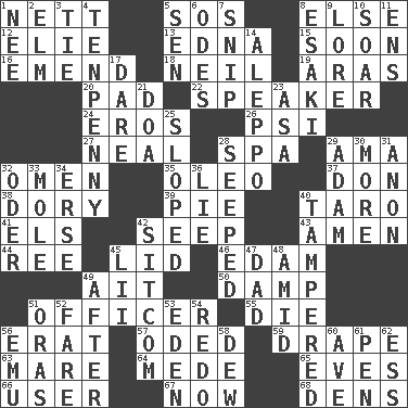 ACROSS 1. Remaining after all deductions 5. Mayday 8. Otherwise 12. Writer Wiesel 13. Pulitzer Prize-winning author Ferber 15. Within a short period 16. Make improvements or corrections to 18. Famous astronaut Armstrong 19. Caspian sea tributary 20. Groovy apt. 22. Orator 24. Greek god of love 26. Air pressure measure (abbr.) 27. Anneal 28. Health resort 29. Housemaid (var.) 32. Presage 35. Margarine 37. Spanish title 38. Small, narrow, flatbottom fishing boat 39. Sliced dessert 40. Edible starchy tuberous root 41. Raised railways 42. Ooze 43. So be it 44. Portuguese money of account (variant) 45. Hat (slang) 46. Dutch treat 49. Small island 50. Moist 51. Person of authority 55. Expire 56. Part of Q.E.F. 57. Wrote a lyric poem 59. Window treatment 63. Female horse 64. Ancient Persian 65. Nights before holidays 66. One who makes use of a thing 67. Immediately 68. Lairs DOWN 1. Born 2. Shade tree 3. Standoff 4. 3-inch nail 5. Elected rep. 6. Lyric poems 7. Sever or remove by pinching or nipping 8. 1973 Nobel Price Winner (Physics) Leo 9. Old wives' tales, e.g. 10. Fly high 11. Followers of ems 14. City in Syria 17. Have the gumption 21. ___ good deed 23. White ___ sheet 25. Inclined 28. Oozed 29. First man 30. Greater amount 31. Soon (poet.) 32. Baltic tributary 33. Undercover agent 34. Celtic language 36. Falsehood 40. ________ with (broke a safety seal) 42. "Cheers" or "Ellen" 45. Cards in a Roman deck? 47. June honoree 48. Among 49. Following 51. Mouths or openings 52. Conductor's collection 53. Paradise 54. Do over again 56. Australian flightless bird 58. Morning condensation 60. "___ Maria" 61. Fenced enclosure 62. Double-curved letter