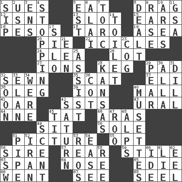 ACROSS 1. Takes to court 5. Erode 8. To draw with force 12. Is not 13. Narrow, elongated depression 15. Hearing organs 16. Mexican monetary units 18. Pacific island yam 19. Toward the sea 20. Sliced dessert 22. Winter's stalactites 24. Entreaty 26. Car dealer's back yard 27. Charged particles 28. Cask 29. Groovy apt. 32. Stitched 35. Scram, to a cat 37. Biblical high priest 38. Cassini of fashion 39. Electrically charged atom 40. Shopping center 41. Boat paddle 42. Fast planes 43. Mountain range 44. Compass dir. 45. Make lace 46. Caspian sea tributary 49. Be seated 50. Not divided or shared with others 51. Photo 55. Choose 56. Title for a man of rank and authority 57. Buttocks 59. Vertical member of a panel or frame 63. Connect, as a bridge 64. Olfactory organ 65. Singer Brickell 66. Left 67. Perceive with the eye 68. Sew up the eyelids of hawks and falcons DOWN 1. Small drink 2. Purpose 3. Followers of ems 4. Closing up, plugging up 5. Eastern Standard Time (abbr.) 6. Jai _ 7. Torque (variant) 8. Started a card game 9. Raze (variant) 10. Ancient Greek god of war 11. Girls' org. (abbr.) 14. Bathroom plumbing fixture 17. Grain storage tower 21. Car or cant ending 23. Gear tooth 25. Help 28. Sunflower state 29. Lightbulb-shaped fruit 30. Silent film actress Nazimova 31. Deli pickle 32. Within a short period 33. Liveliness 34. Past tense of be (plural) 36. Small bed 40. French bagpipes 42. Titan orbits this 45. Teat (slang) 47. Friend of Pooh 48. High mountains 49. Odor 51. Corncob 52. SW Asia republic 53. Vintage cars 54. Relaxation 56. Compass dir. 58. To sift 60. Binary compound 61. Untruth 62. Snakelike fish