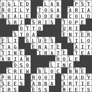 ACROSS 1. Stared 6. Experiment locale 9. Pacific Standard Time (abbr.) 12. Agitated, as a liquid 13. Ancient Roman robe 14. Operatic vocal solo 15. Memphis, Tenn. Street 16. River in Europe 17. Chilled 18. _ Lanka 19. Indian titles of respect 20. Drink excessively 21. Von Bismarck 23. RI univ. 24. Portico 25. Keyboard key 28. Connecticut Ivy Leaguer 30. Cements 34. Grain storage tower 35. Label 36. Related on the mother's side 38. Small island 39. Prong on a fork 41. Feeling or showing extreme anger 43. Beverage made from leaves 44. Believer in; advocate of (suffix) 46. Opening into or through something 48. Bear (Spanish) 49. Actor's bit 50. Group working together 51. Coalition 53. Compass dir. 56. Silvers or Donahue 57. Carrot, for example 58. Sycophant 60. Observes 61. Swedish rock group 62. Nick name for Arthur 63. Big collection agency 64. Curvy letter 65. Confronts DOWN 1. Globe 2. Moves 3. One who doesn't tell the truth 4. American author Paul (1891-1958) 5. Color 6. Farming town in central California 7. Eons 8. Tavern 9. Appease 10. Drop; flow; fall 11. Small amount or degree 13. "Corrida" creature 14. Oak nuts 19. Having lost freshness 20. Third day of the wk. 22. Coat; cloak 24. Seigniories (variant) 26. Writer Wiesel 27. Round or rotation of duties 28. Singer James 29. Den 31. University (slang) 32. Ewer handle 33. R.R. building 37. Principle of right and wrong 40. Artist's stands 42. A really long time 45. Immediately 47. Poe poem 49. Globular water bottle used in Asia 50. "Mermaids" star 51. Moves up and down 52. Tennis shots 54. Nathan's nickname 55. Prepare for publication 56. 23rd letter of the Greek alphabet 57. Actress Charlotte 58. Scottish cap 59. It is so