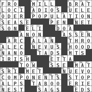 ACROSS 1. From 4. Place where flour is made 8. Naughty child 12. Venues 14. Goodbye (Sp.) 16. Ubangi River tributary 17. River in Europe 18. Census information 20. Gospel singer Marvin 22. Fenced enclosure 23. Fish or hair follower 24. Male child 25. Connecticut Ivy Leaguer 28. ___ good deed 30. At once, immediately (arch.) 31. NE Netherlands city 35. Curve 37. ____ Jay Lerner 40. Through, poetically 41. Actor Baldwin 42. Congenital growth or mark on the skin 44. Parka part 45. Billionth: prefix 46. Bits 47. Mountains (abbr.) 48. From or relating to Ireland 50. Singer James 52. Pull behind 54. Compass dir. 55. Floor protector 58. Indian title of respect (Mr.) 61. Was introduced to 63. New (sp.) 65. Parts 70. Discontinue 71. High mountains 72. Off limits 73. 4th largest of the Great Lakes 74. A home for chicks 75. Droops 76. Begley and Asner DOWN 1. Soft thread for cleaning between teeth 2. Cowboy competition 3. Sea 4. Atlas unit 5. Wedding promise 6. Mouth edge 7. Central Nebraska county 8. Yet 9. It's straight from the horse's mouth 10. Medicinal plant 11. Portable shelter 13. Big collection agency 15. Downhill vehicle 19. Small Philippine buffalo 21. Car or cant ending 26. Grant temporary use of 27. An arm off of a larger body of water 29. Respiratory problem 30. Buttonhole 32. Attempt 33. Greek god of love 34. Lower and raise head in agreement 35. Having or resembling wings 36. Painter Guido (1575-1642) 38. Actress Gardner 39. Unclothed pictures 41. Cuckoo 43. Fast planes 49. Same (prefix) 51. Nine, plus one 53. Gone 55. Distance measurement (Brit.) 56. Prevent the occurrence of 57. Drinks excessively 58. Glance over 59. Hero or heavy, e.g. 60. Naughty children 62. Beverages made from leaves 64. Purpose 66. Pacific Standard Time (abbr.) 67. Basketball assoc. 68. Coat; cloak 69. Distress signal
