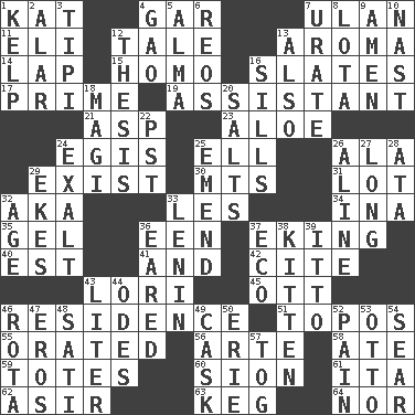 ACROSS 1. Krazy ___ of comics 4. Slender fish 7. ____ Bator, Mongolia 11. Biblical high priest 12. Falsehood 13. Odor 14. Infant locale 15. Like (prefix) 16. Chalkboards 17. A-one 19. Aide 21. Viper 23. _ vera 24. The front part of a cuirass 25. Pipe bend 26. According to 29. Have an existence 30. Mountains (abbr.) 31. Car dealer's back yard 32. Alias (abbr.) 33. French article 34. _ tizzy (2 wds.) 35. Set 36. Car or cant ending 37. Supplementing with great effort 40. Eastern Standard Time (abbr.) 41. Plus 42. Quote 43. Australian parrot (variant) 45. Baseball player Mel 46. Dwelling 51. Literary convention 55. Spoke pompously 56. Johnson of "Laugh-In" 58. Had dinner 59. Hauls 60. The Jewish people; Israel 61. Call ___ day 62. SW Saudi Arabia district 63. Cask 64. Not either DOWN 1. Seaweed 2. Having or resembling wings 3. Native american tent (variation) 4. E Mali city 5. _ mater 6. Vintage cars 7. A salt of uric acid 8. Globular water bottle used in Asia 9. So be it 10. Political cartoonist Thomas 12. College paper 13. In addition 16. Beverly of Met fame 18. Wise men 20. Table seasonings 22. Pacific Standard Time (abbr.) 24. Honor 25. Make improvements or corrections to 26. Place in a line 27. Having great length 28. "One Day ___ Time" 29. Makes supply last 32. Ripen 33. Soviet premier 1918-24 36. Having ears or earlike features 37. Environmental prefix 38. Baby cat 39. "Tell ____ the Marines!" 43. 61 cubic inches 44. Lyric poems 46. Roll call or roster of names 47. Greek god of love 48. Suttee (variant) 49. Keg 50. One of the Great Lakes 52. Ache 53. Von Bismarck 54. Wither 57. Coat; cloak