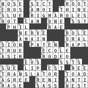 ACROSS 1. Sense of smell 5. Religious group 9. Carrot, for example 13. Greek god of love 14. Mine, in Marseilles 15. One or ones belonging to thee 16. Turn sharply 17. Frustrating wastes of time 19. Being at a high temperature 20. Auto 21. Single 22. Fast jet (abbr.) 23. Silvers or Donahue 25. Actress Charlotte 26. Boldness 30. Hero or heavy, e.g. 34. With great haste 35. Taken by mouth 36. The Jewish people; Israel 39. Eucharist need 42. Atlas contents 43. Loyal 44. Learning spot: Fr. 46. SW Saudi Arabia district 47. Cowboy competition 48. Greek goddess of the dawn 51. Fast planes 54. Take to court 57. Mouth edge 58. Eastern Standard Time (abbr.) 60. To riddle 62. Interpreter 65. Frog relative 66. Match 67. Painter Guido (1575-1642) 68. Against 69. Raze (variant) 70. Backtalk 71. 270 degrees DOWN 1. Delicate 2. Fourth or lowest deck 3. 180 degrees 4. Compass dir. 5. "Two Mules for Sister ____" 6. Independent ruler or chieftain 7. Gear tooth 8. The easternmost of the Lesser Sundas 9. 17th letter of the Greek alphabet 10. Petroleums 11. Washington bills 12. Trial 15. Woody plant 18. Santa ___, CA 20. To starve (Brit.) 24. More empty; more void 27. Strike 28. By way of 29. Keyboard key 30. Lover boys 31. Mouth or opening 32. Pet locale 33. Raised railways 36. R.R. building 37. Big collection agency 38. Fr. "Yes" 40. Environmental prefix 41. Allow head to fall sleepily 45. For fear that 48. Otherwise 49. Lubricate 50. Practice fights 52. Marketplace scale 53. Theater features 54. Play the lead 55. Capital and largest city of Mongolia 56. Hearing organs 58. Immeasurably long periods of time 59. Indian titles of respect 61. Prepare for publication 63. Born 64. Afternoon social gathering 65. The 23rd letter of the Hebrew alphabet