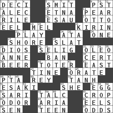 ACROSS 1. Tenth: prefix 5. Stricken, poetically 9. Pacific Standard Time (abbr.) 12. Actor Baldwin 13. Inactive volcano in Sicily 14. Lightbulb-shaped fruit 15. Cause heat under the collar 16. Son of Isaac 17. Von Bismarck 18. Snakelike fish 19. Cartoonist voice _ Blanc 21. Japanese brewing company 22. Shaw product 24. _ moment's notice (2 wds.) 26. Single 27. Dinah or Pauly 28. Narrow board 29. "Vaya con ____" 30. Former Milwaukee Brewers owner Bud 32. Margarine 36. Singer Murray 37. Prohibit 38. Certainty 39. Fermented drink made from hops 40. Carrier 42. 90 degrees 43. Prong on a fork 44. Speak pompously 46. Parent Teacher Assoc. 49. Marina Del _, California 50. Hyperbolic tangent 51. 1973 Nobel Price Winner (Physics) Leo 53. A female animal or person 54. Ovum 57. Indian skirt 58. Baby powder 61. Riding implement 62. Scent 63. Operatic vocal solo 64. Snakelike fish 65. Elected rep. 66. Adolescent 67. Likelihood DOWN 1. Have the gumption 2. Writer Wiesel 3. Portable communications device 4. Frozen water 5. Sew up the eyelids of hawks and falcons 6. Mountains (abbr.) 7. _ tizzy (2 wds.) 8. The 19th letter of the Greek alphabet 9. Stone: prefix 10. Smooth fabric 11. Marketplace scale 14. Luau course 19. Third mo. 20. Sight organs 21. Krazy ___ of comics 23. Failure 24. Place in a line 25. Label 27. Trig term 28. Schedule 29. Apply (a substance) by light strokes 31. Dark wood 32. Sea 33. Resembling or made to resemble leather 34. Celtic language 35. Baseball player Mel 40. Neckwear 41. Writer of Portnoy's Complaint (1969) 43. Three (prefix) 45. Actress Charlotte 46. Mexican monetary units 47. Sadhe (variant) 48. Composer Copland 52. Apertif with cassis 53. Glance over 55. Gilded 56. Global Positioning Systems (abbr.) 58. Make lace 59. "We ___ not amused" (Victoria) 60. Whopper 61. Corporate head (abbr.)