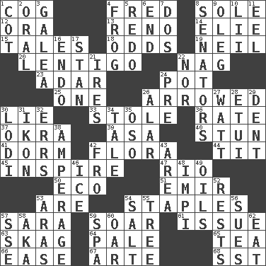 ACROSS 1. Gear tooth 4. Flintstone 8. Not divided or shared with others 12. Mouth or opening 13. Western Nevada city 14. Writer Wiesel 15. Falsehoods 18. Probability 19. Famous astronaut Armstrong 20. Small, flat, pigmented spot on the skin 22. Tired old horse 23. The sixth month of the Jewish calendar 24. Plant holder 25. Single 26. Moved like an arrow 30. Falsehood 33. Fur scarf 36. Assign a rank or rating to 37. Gumbo ingredient 39. White ___ sheet 40. Surprise greatly 41. Dormintory (informal) 42. Plants 44. Teat (slang) 45. Stimulate to action 47. River (Sp.) 50. Environmental prefix 51. Arab leader 53. "We ___ not amused" (Victoria) 54. Paper fasteners 57. "Two Mules for Sister ____" 59. Fly high 61. Come out of 63. Heroin 64. Light colored 65. Beverage made from leaves 66. Relaxation 67. Johnson of "Laugh-In" 68. Fast jet (abbr.) DOWN 1. Small bed 2. Taken by mouth 3. An organ shaped like a helmet 4. Toadlike animal 5. Redecorate 6. Conclusion 7. Two (Sp.) 8. Legislators 9. Cassini of fashion 10. Cards in a Roman deck? 11. Snakelike fish 16. Inside; within (prefix) 17. Comedian Laurel of Laurel & Hardy 21. Angers 22. Or not 24. Before (prefix) 26. Having or resembling wings 27. Electrical Unit 28. Needle case 29. Scratch 30. Farming town in central California 31. Image 32. Blunders 34. Lie 35. Bear (Spanish) 38. Electrical Measurement 42. From 43. Type of rug 46. Frozen water 48. Body of Kaffir warriors 49. Petroleums 52. Musical pauses 53. Ancient river in northeast Turkey 54. Table seasoning 55. Relationship diagram 56. Institutes legal proceedings 57. Compass dir. 58. Alias (abbr.) 59. Health resort 60. Rowing implement 62. Ingest